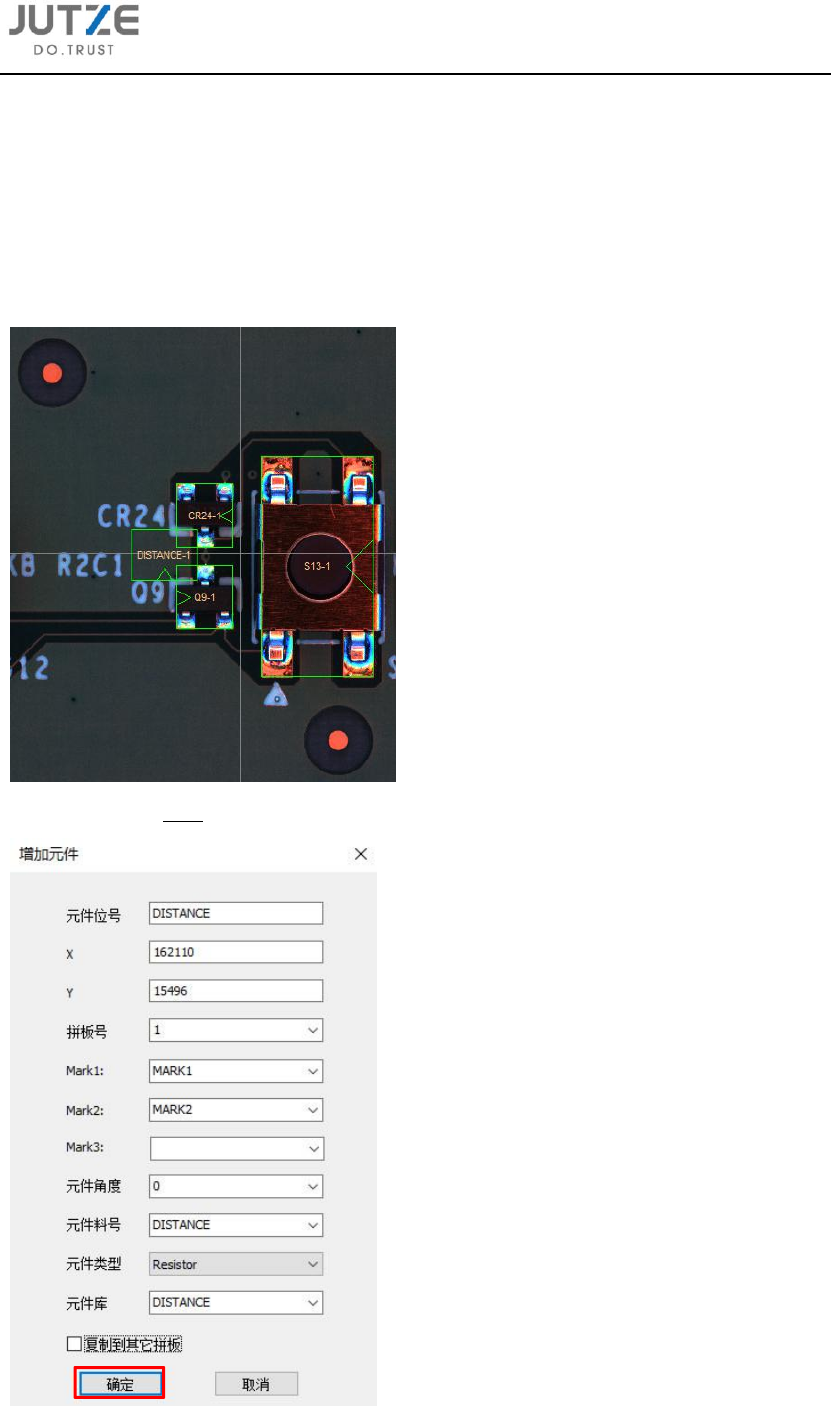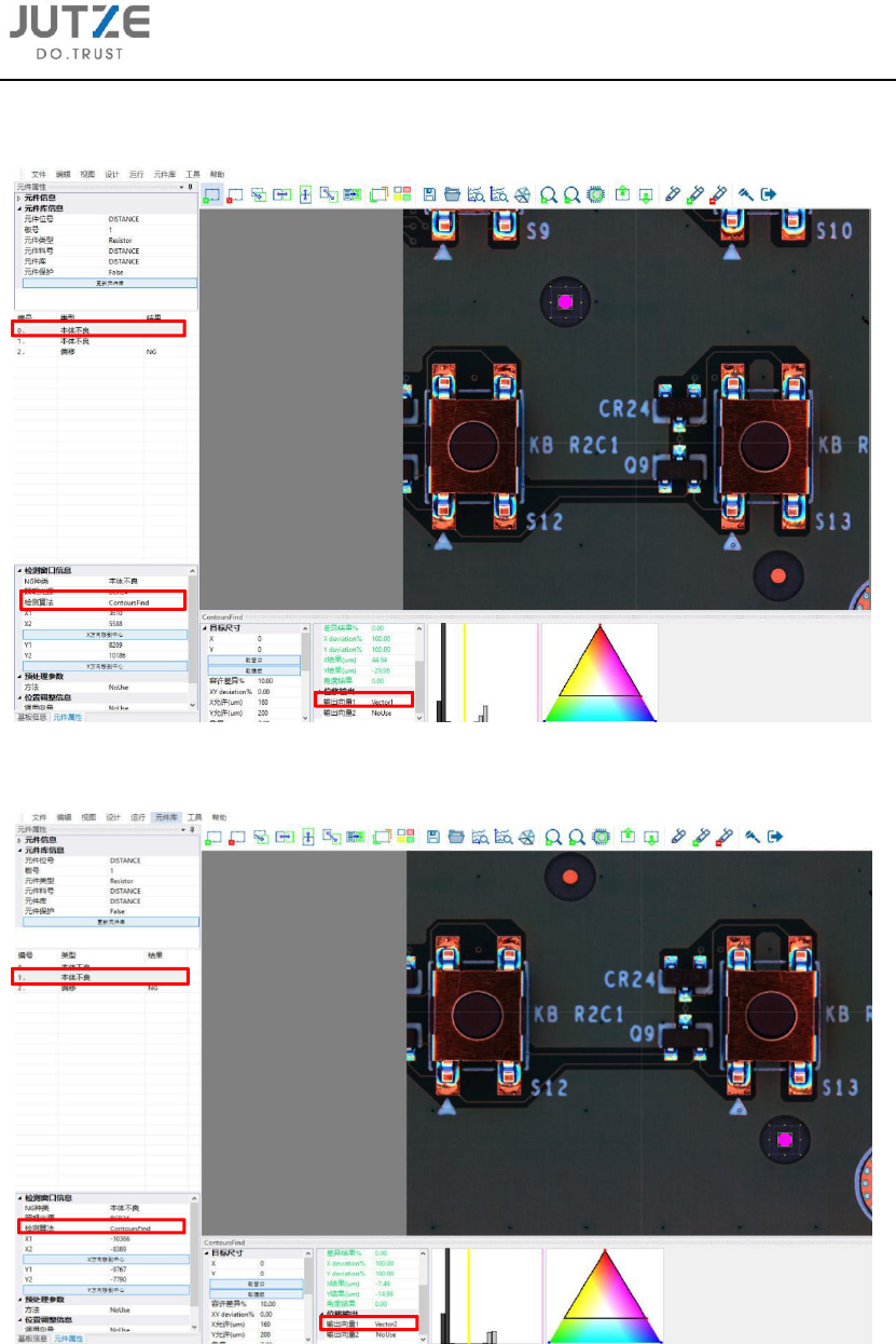第十五章 软件功能设定的介 绍 V 7.0.4584.0-2 www .jutze. com.cn 133 / 136 C 在元件编 辑界面中新 建第一个检测 窗口: 使用 Cont oursFin d 算法搜索 到第一个标 记点的位置, 并输出向量 V1 ; D 在元件编 辑界面中新 建第二个检测 窗口: 使用 Cont oursFin d 算法搜索 到第二个标 记点的位置, 并输出向量 V2 ;