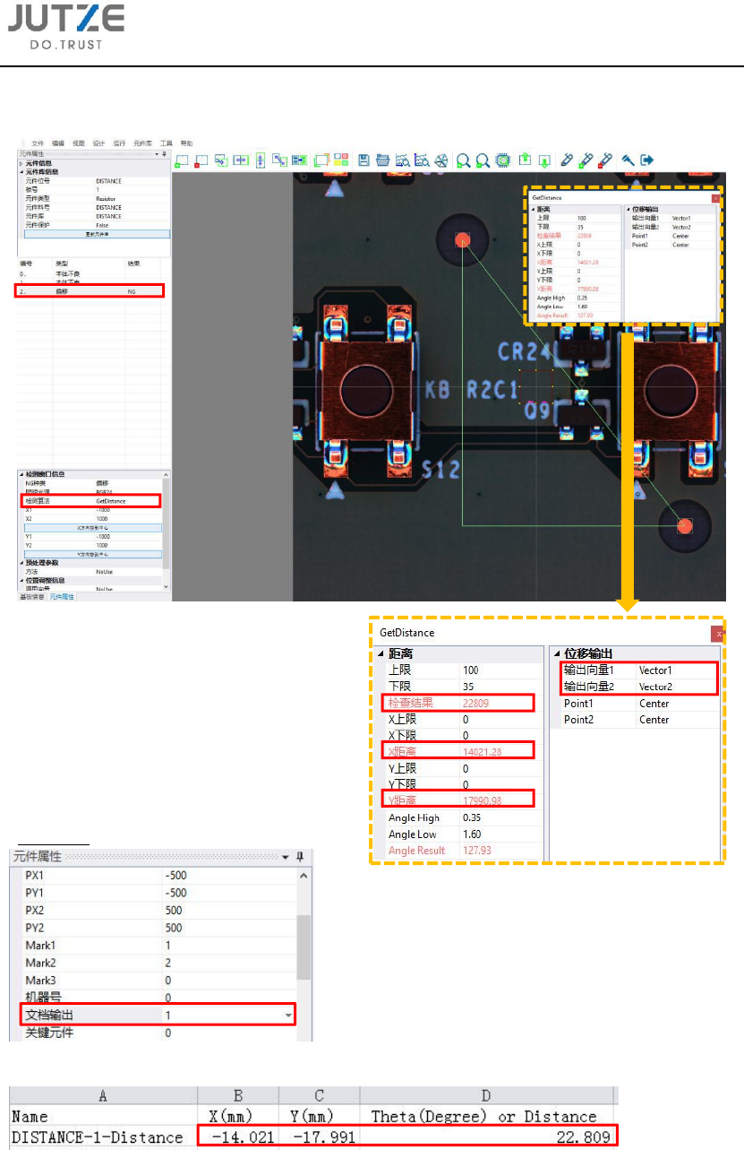 E 在元件编辑界面中新建第三个检测窗口:使用 GetDistance 算法,并调用 V1 和 V2。计算得