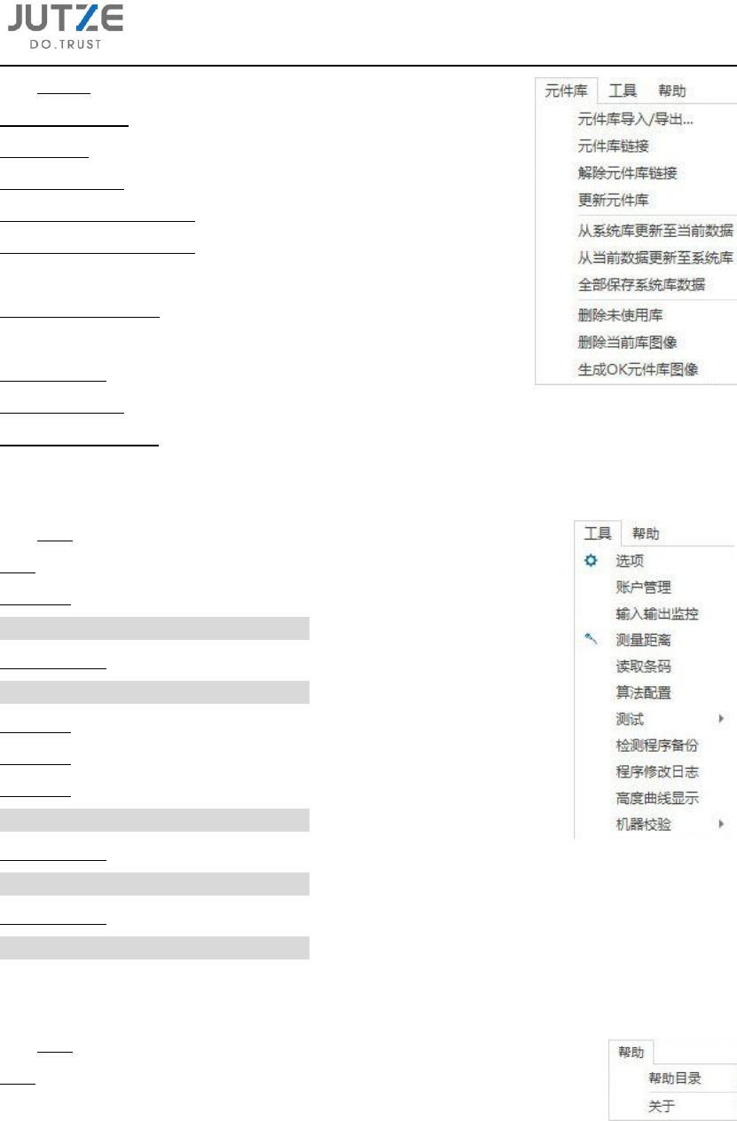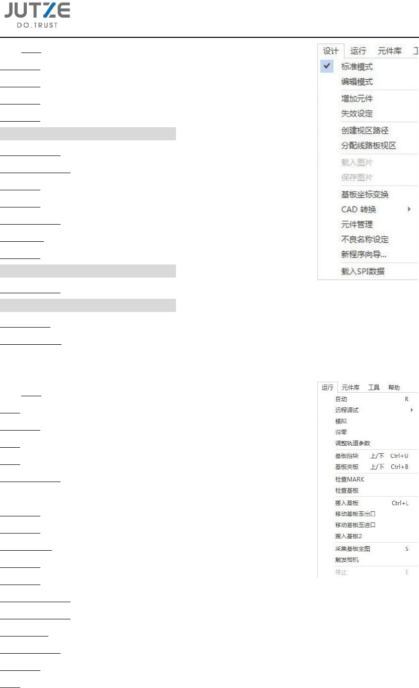 第三章 软件 主界面和基本 操作指 令介绍 V 7.0.4584.0-2 www .jutze. com.cn 19 / 136 D. 设计:是 关于软件程序 编写的相关选项。 标准模式:正 常检查模式; 编辑模式:使 程序进入可编 辑状态; 增加元件:在 程序中手动添 加一个元件; 失效设定:进 入失效设定界 面; (详细介绍 请参见第十五 章第 15.1 节) 创建视区路 径:创建检查 基板时的 FO V 路径; 分配线路板 视区:…