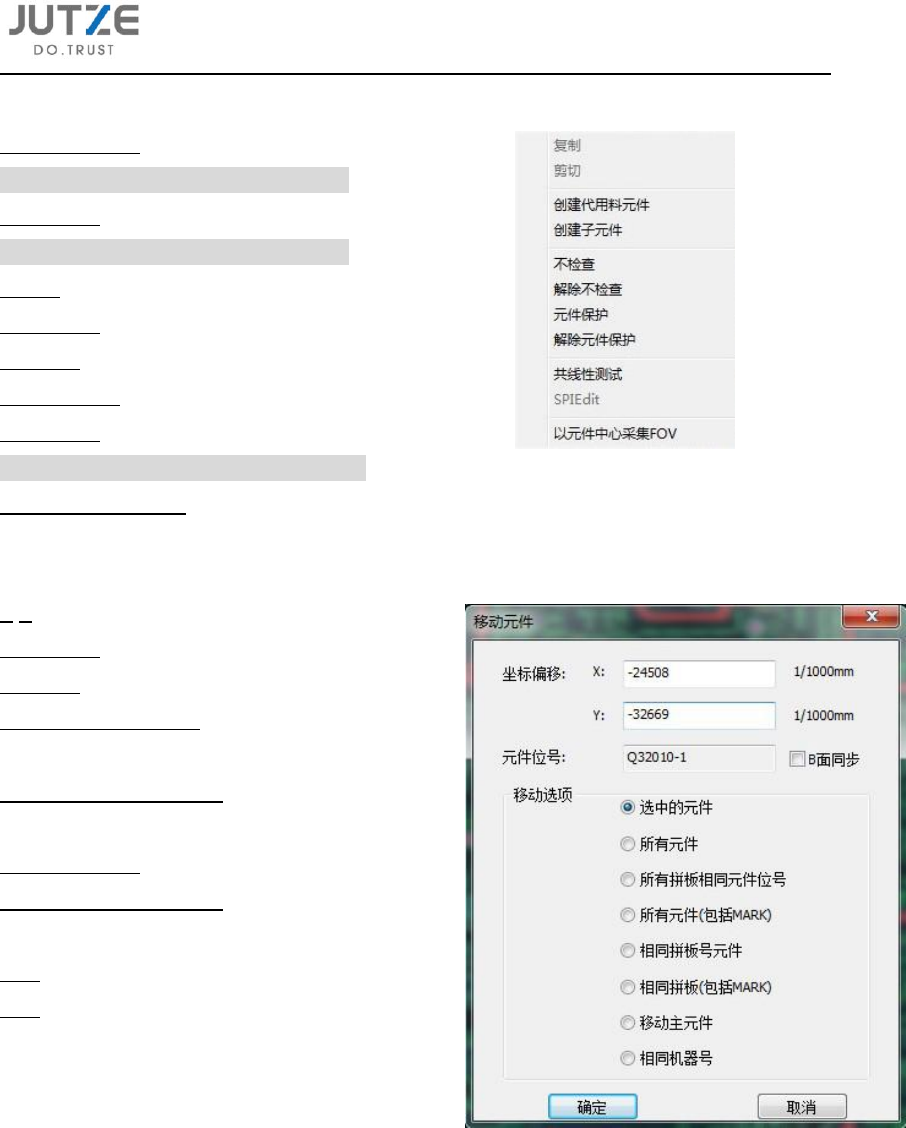 第三章 软件 主界面和基本 操作指 令介绍 V 7.0.4584.0-2 www .jutze. com.cn 22 / 136 I. 选中某一元 件后,单击鼠 标右键:显示元 件编辑副选窗口。 (如下图) 创建代用料 元件:点击可创 建代用料; (详细介绍 请参见第十五 章第 15.3 节) 创建子元件 :点击进入 创建子元件界面; (详细介绍 请参见第十五 章第 15.4 节) 不检查:点 击设定元件不 检查; 解除不检查 :点击解…