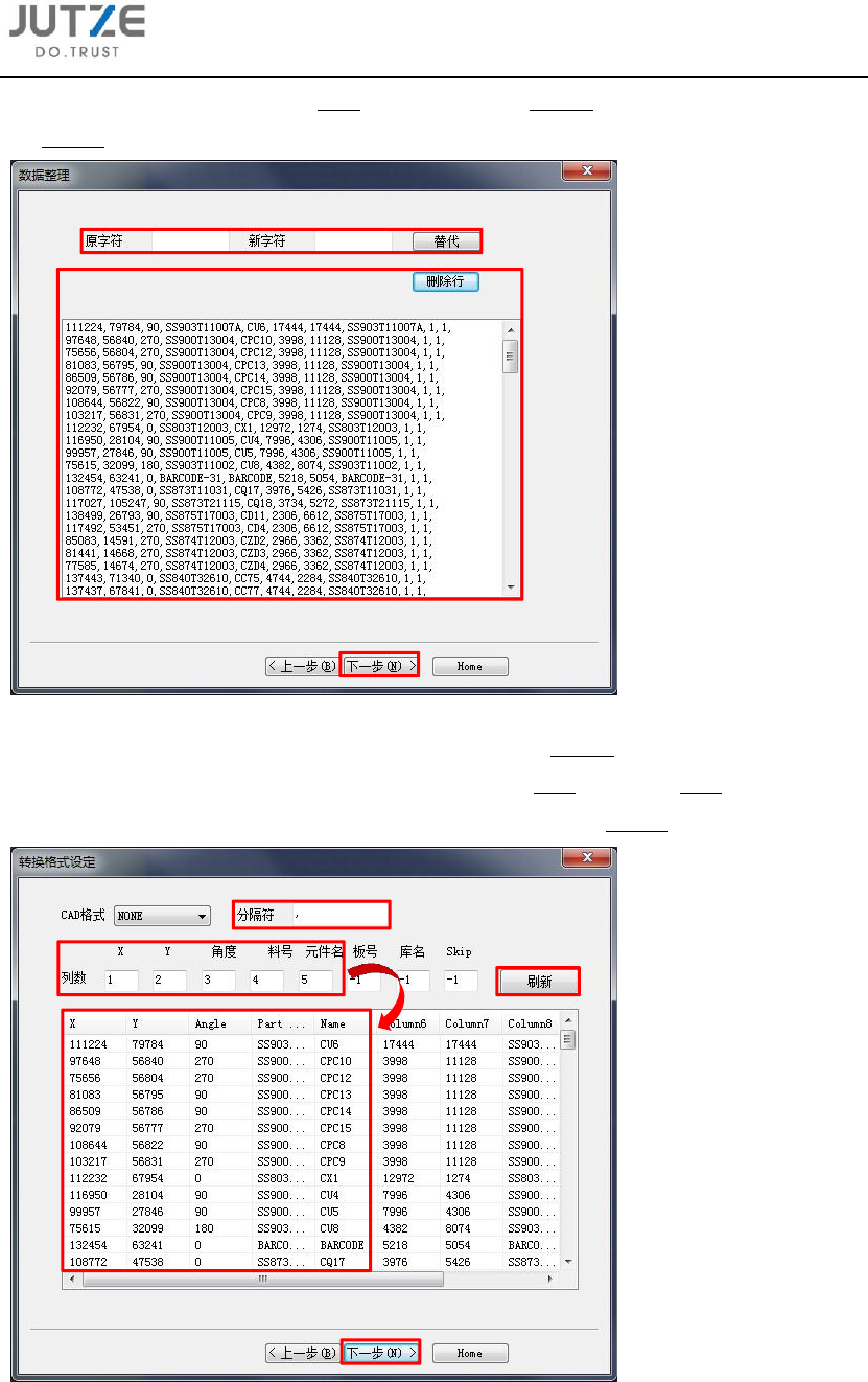 第五章 新程 序的创建和生 成 V 7.0.4584.0-2 www .jutze. com.cn 30 / 136 5.1.1.4 在 数据 整 理界面 中 可使 用替 代更 换 字符 或者 使用 删除 行删 除 多余 的数 据, 整 理完毕 后 点击下一 步; 5.1.1.5 在 转换 格 式设定 界 面中 首先 填写 数 据中 实际 使用 的 分隔 符, 然后 在 相应栏 位 中填 写用 分隔符分隔 后的 X 、 Y 、角度、料号…