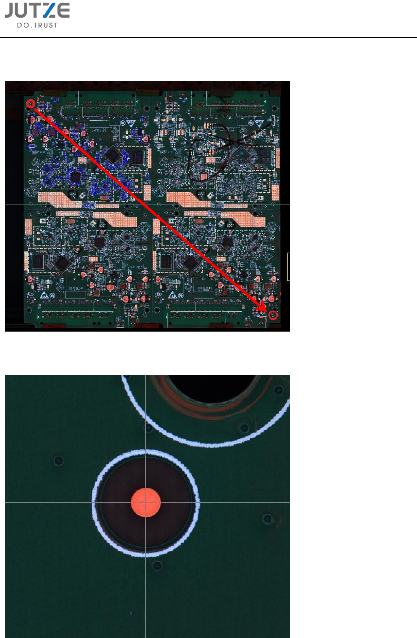 第六章 基准 标记点的制作 V 7.0.4584.0-2 www .jutze. com.cn 43 / 136 6.2 第二 个 Mark 的 制作 6.2.1 在基板 上第一个 Mark 的对角 位置选取第二个 Mark ; 6.2.2 对准 Mark 中心 点击鼠标左键 ,使灰色十字中心 对准 Mark 中心 ;