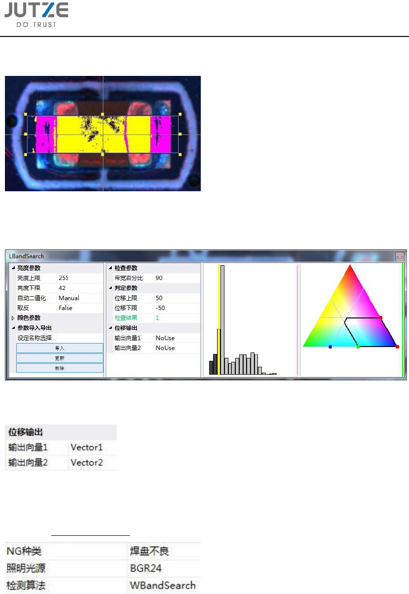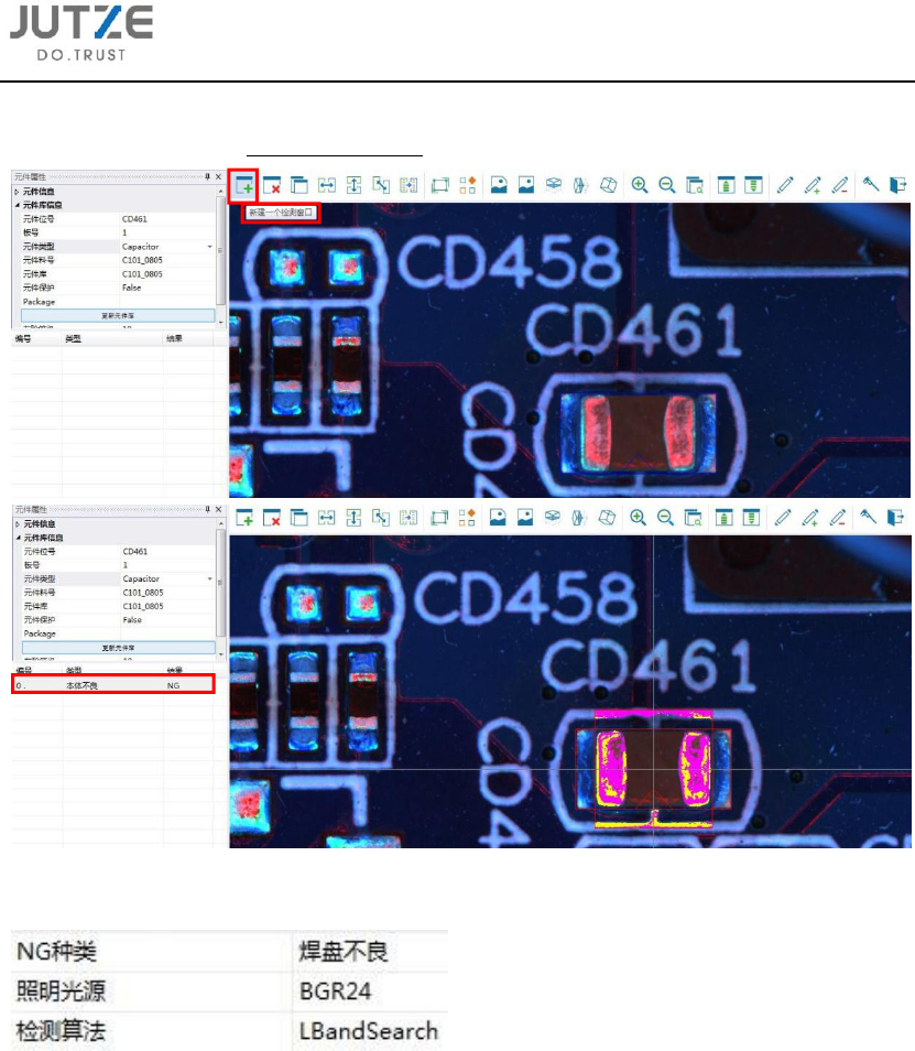 第七章 CH IP 类元件通用 资料库的编写 V 7.0.4584.0-2 www .jutze. com.cn 49 / 136 7.3 焊盘 不良 1 7.3.1 点击快 捷菜单栏上新建 一个检测窗口 ,使左侧检 测窗口信息栏 中增加一行检 测项; 7.3.2 设定 NG 种类 、照明光源和检 测算法;