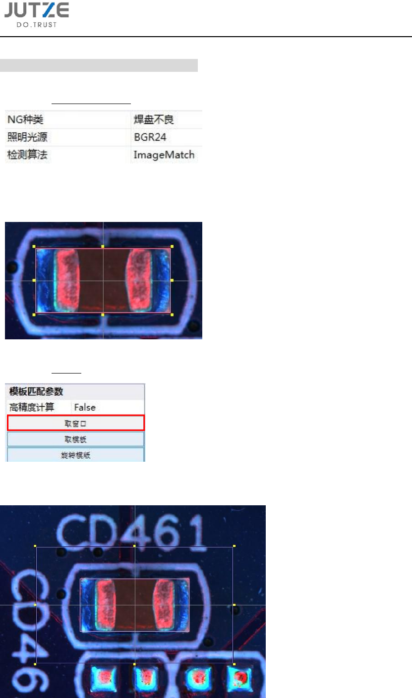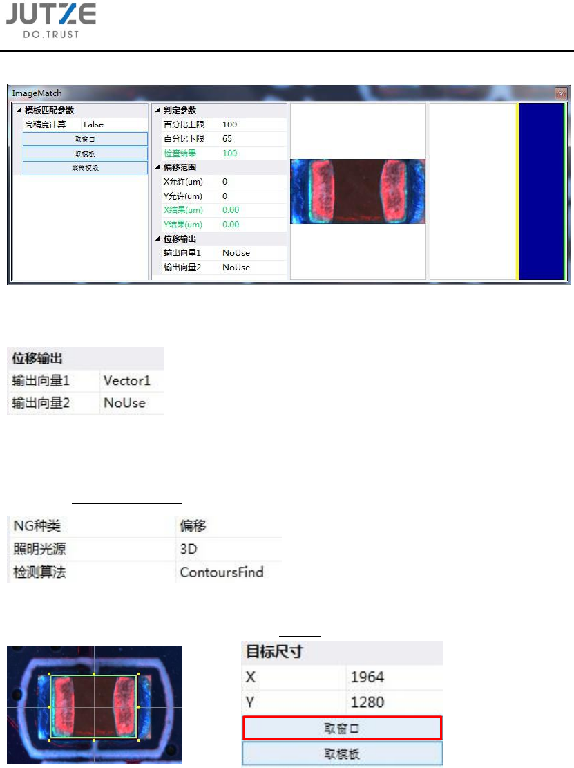 第七章 CH IP 类元件通用 资料库的编写 V 7.0.4584.0-2 www .jutze. com.cn 53 / 136 7.5.5 设定判 定参数百分比上下 限; 7.5.6 设定输 出向量。 7.6 偏移 7.6.1 点击 新建一个检测窗口 (同 7.3.1 中操 作),并设定 NG 种类 、照明光源和 检测算法; 7.6.2 检测窗 口大小调整为元件 的大小,点击 取窗口,获 取元件 X 和 Y 方向的 尺寸;