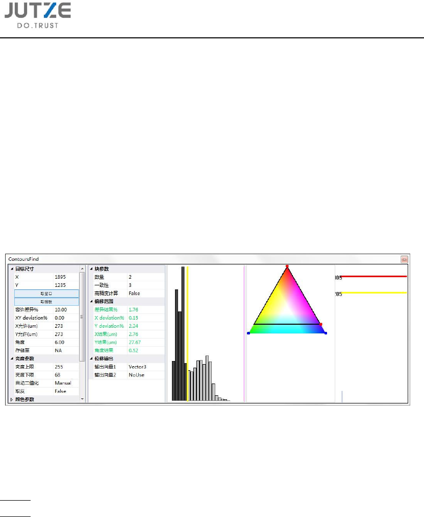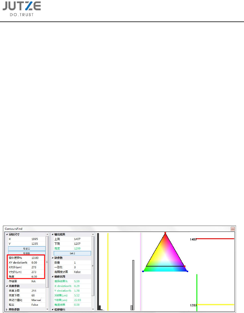 第十章 主要 算法逻辑解释 V 7.0.4584.0-2 www .jutze. com.cn 92 / 136 10.10.5 块参 数 数量: 设定组成目 标的连通区域 数量 一致性: 连通区域几 何尺寸的大小 接近程度( 0 , 1 , 2 , 3 , 4 ) 10.10.6 判定 参数 容许差异 % : 设定实际目 标与设定目标 之间容许差异百 分比 XY dev iation% : 设定实际目 标与设定目标 之间 XY 长度差…