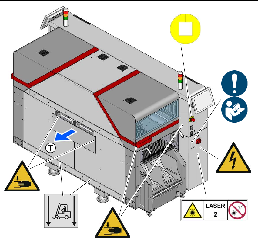 下图显示的是 SIPLACE TX2 贴片机。所有 SIPLACE TX 系列贴片机型号警告标签的位置均相