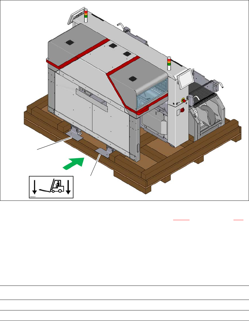 最好仅在贴片机输出端所在的那一侧将运输板条箱或货盘吊起 (图 4.2 - 2 中的部件 A,第 169