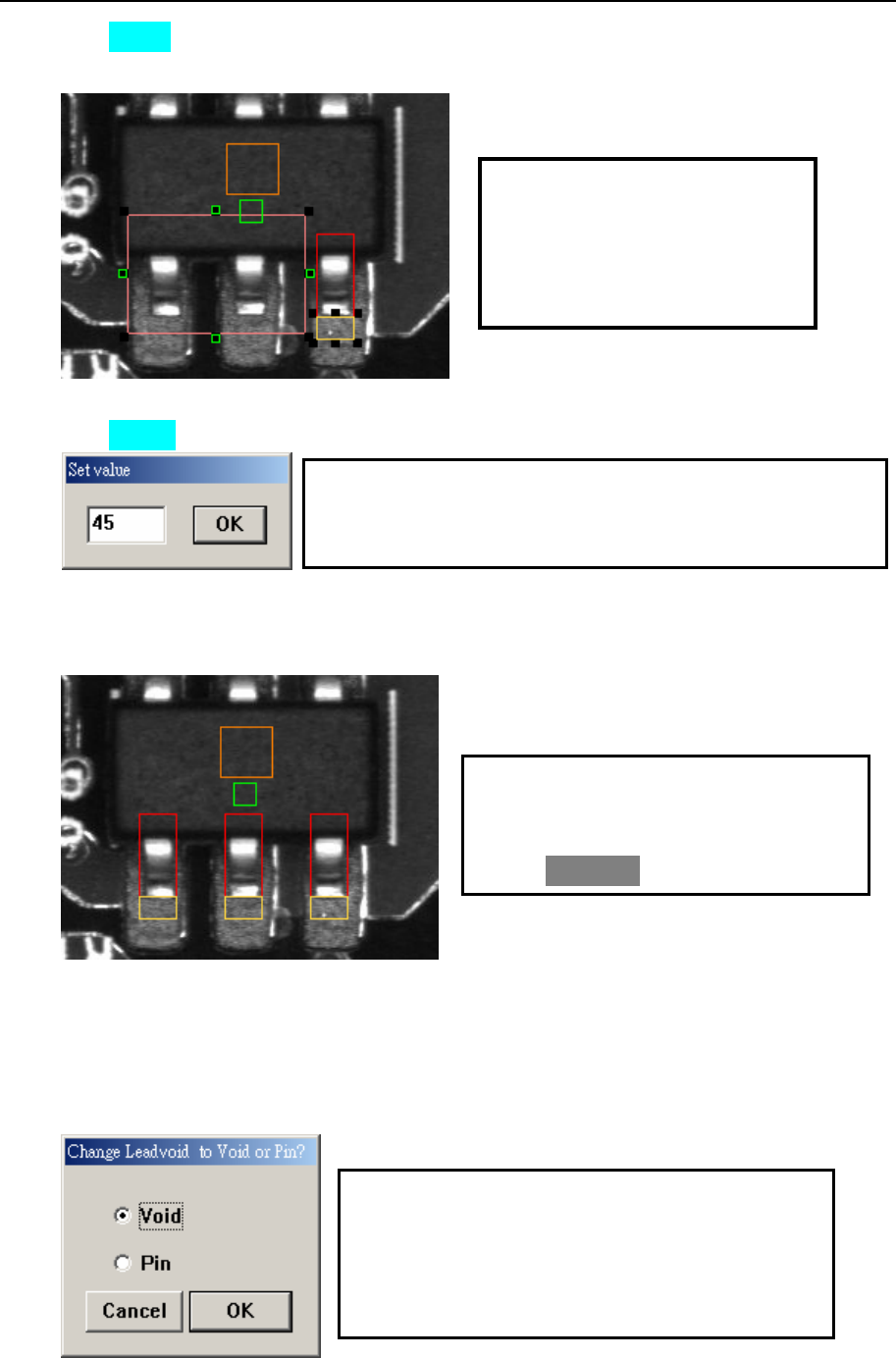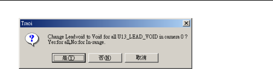 TR7100 AOI 簡易程式製作手冊【 TT088 】 第 27 页 共 45 页 2 0 0 6 - 0 4 - 2 0 ㈡ 在上圖對話框中選擇 “⊙ Vo i d ”項 ,點擊 “ OK ” ,出現以下對話框 ① 選擇 “是 ( Y )” : 表示將整個類型中所有的 “ Lvoid 框” 都轉換成 “空焊框” ② 選擇 “否 ( N ) ”: 表示只將 “編輯框” 所框住的 “ Lvoid 框” 轉換成 “空焊框” ㈢ 在上圖對話…