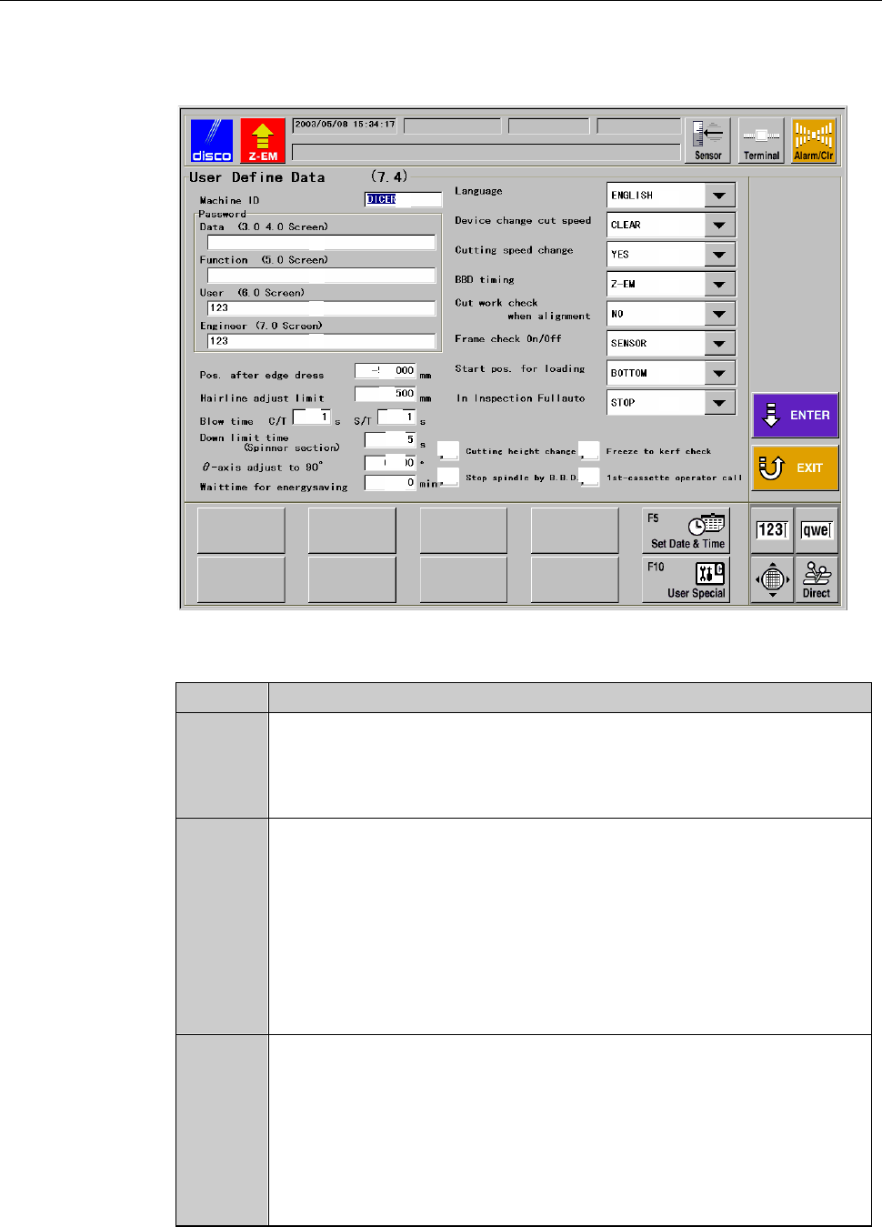 In the USER DEFINE DATA screen [screen 7.4], you can change the machine