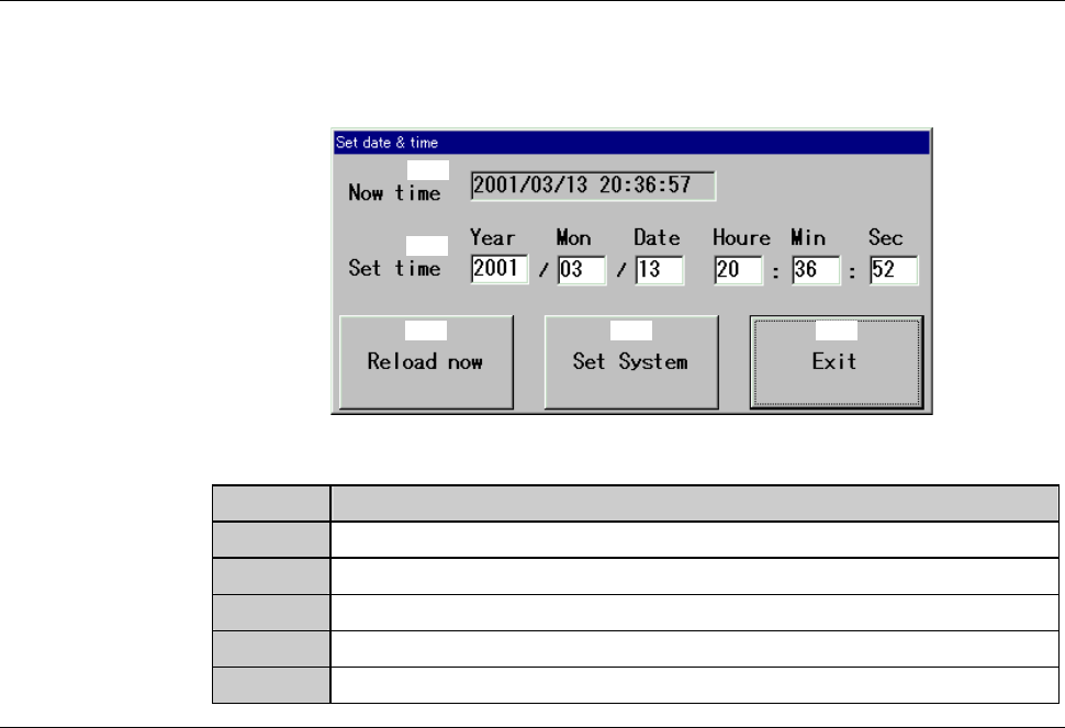 C-49 SET DATE & TIME dialog box The description of SET DATE & TIME dialog box is as follows: [Screen] [1] [2] [3] [4] [5] [Setting Ite m] Item No. Description s [1] Indicates the curre nt date and time. [2] Input…