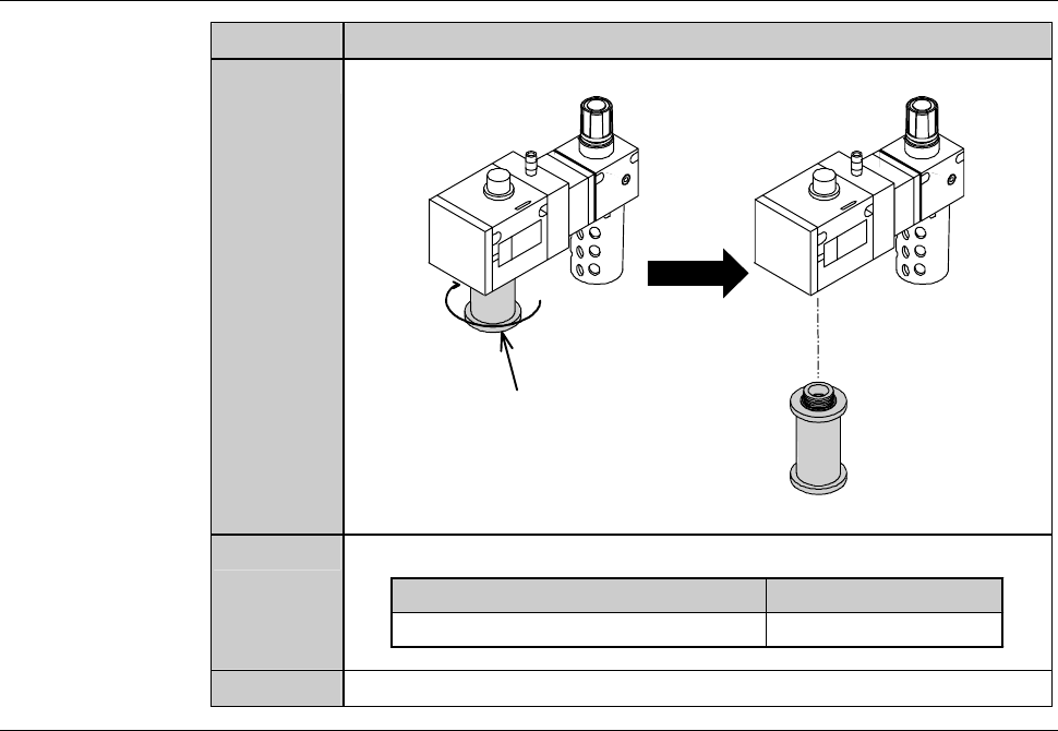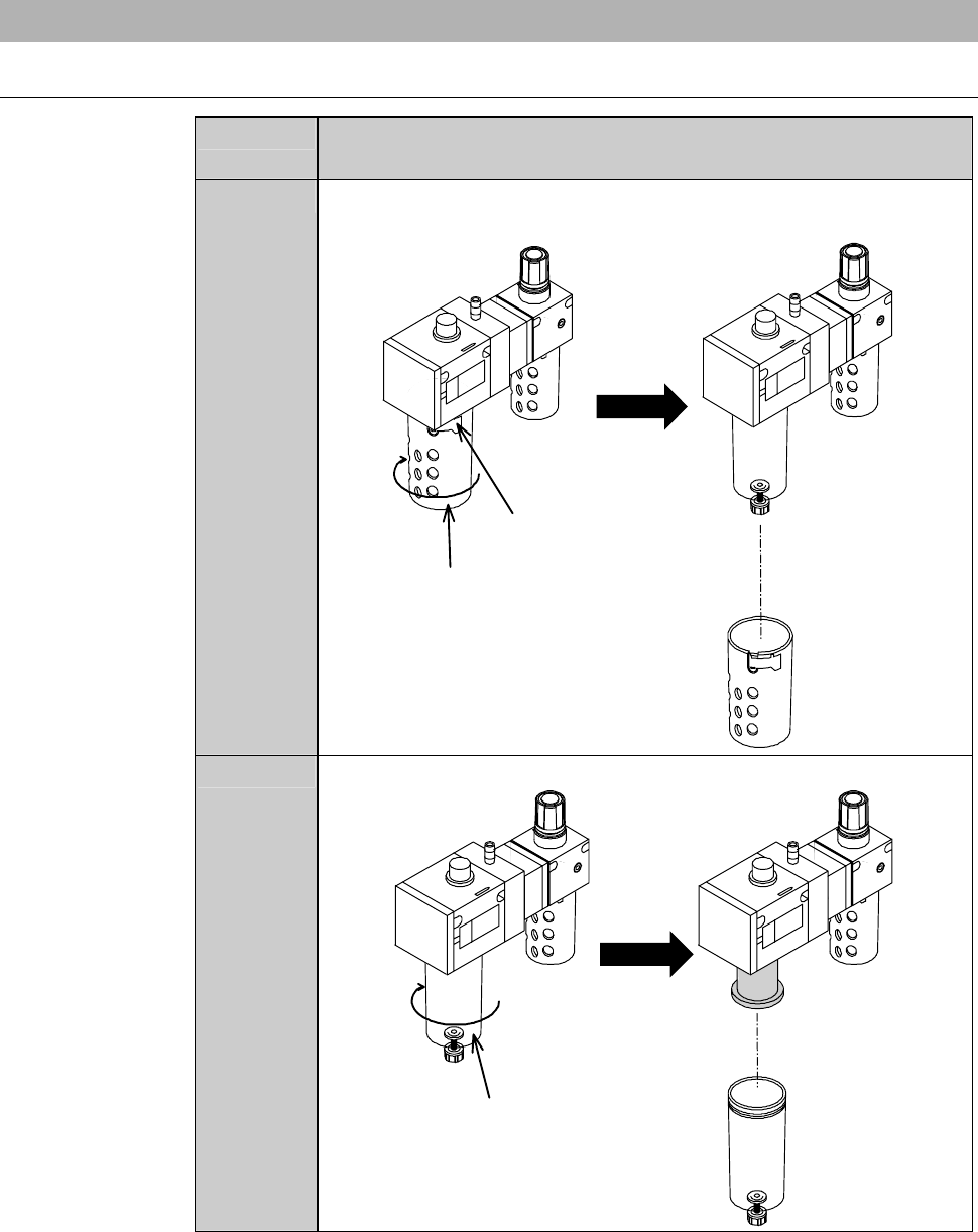 F-7 1-1-2. Re placing t he mist separator element Procedur es for replaci ng the mist separ ator el ement Step No. Do This (Continued from the previous section.) 1 While pressing the lock lever, unsc rew the case b y tur…