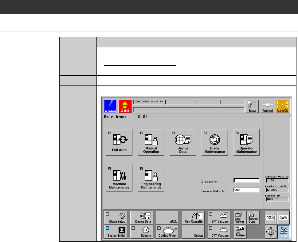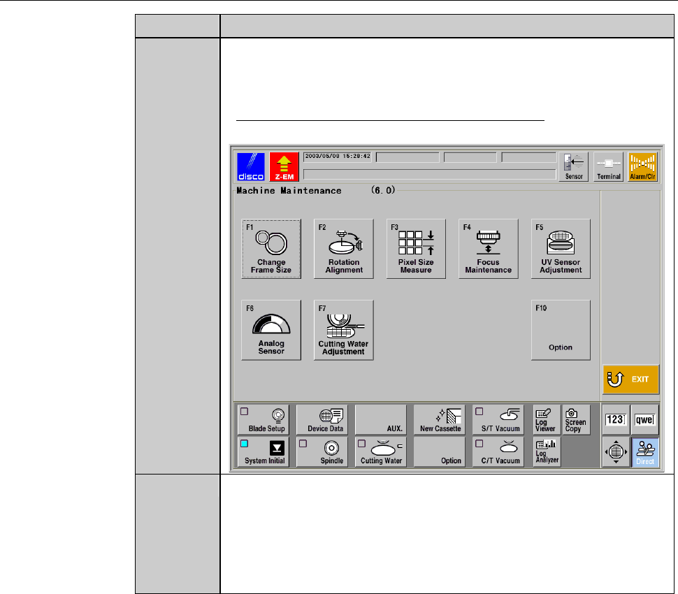 B-4 1-1. Removin g the chuck table Procedur es for re moving the c huck table Step No. Do This 1 Execute setup. - For the setup procedure; See the section B-7, [Setup] of the Operation Manual. 2 Press the <Sy stem Ini…