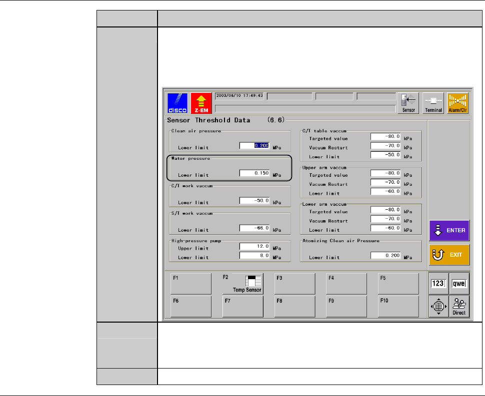 B-133 Procedur es for s etting moni tor v alue of d eioniz ed water pressure (Contin ued) Step No. Do This 5 Press the <F6> button on the MACHINE MAINTENANCE screen [scr een 6.0]. - The SENSOR THRESHOLD DATA screen…