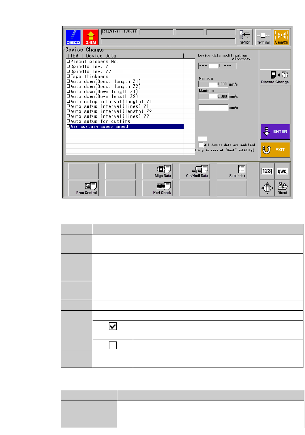 C-63 Devi ce data whose set tings cann ot be modi fied Settings of the following device data cannot be modified. Device Data No . Device Data 000 MM-SAMPLE 111 I NCH-SAMP L E DEVICE DATA CHANGE screen - conf irmation [Sc…