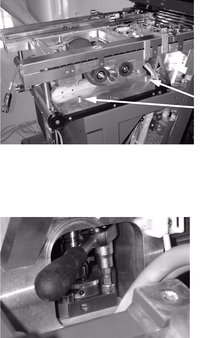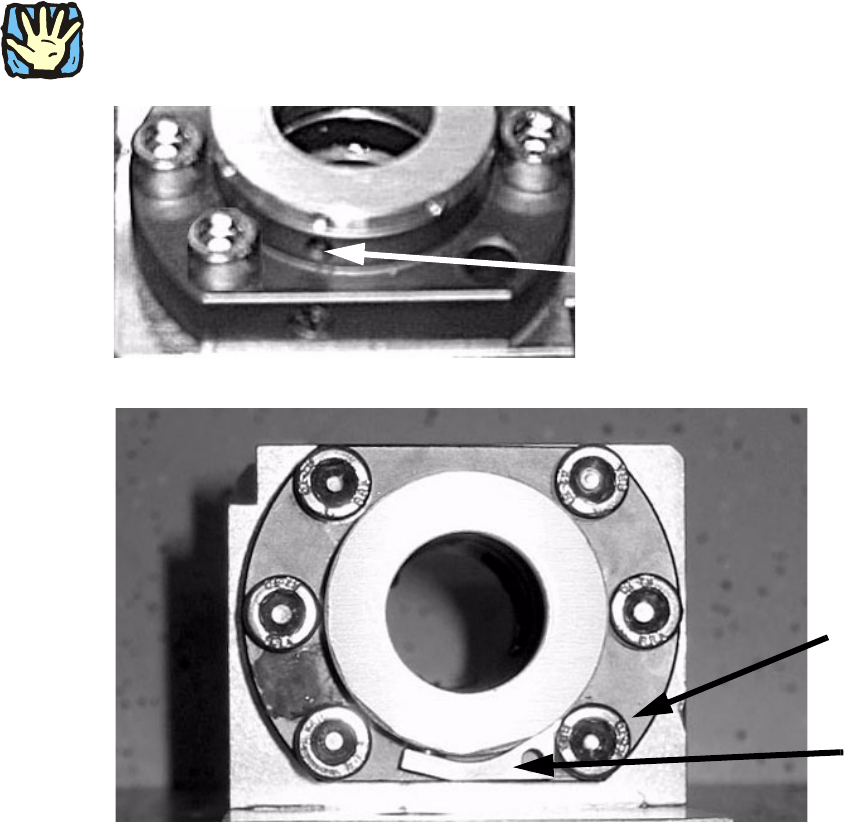 Einbau Halteklammer Hubachse/Ausricht ung Spindel /Kontrolle Zahnradbefestigung S pindel MTC2 Ausgabe 06/2004 15 : Führen Sie den S tift der Haltek lammer an der im Bild gezeigten Positio n in die Flansc hmutte r ein. 1 …