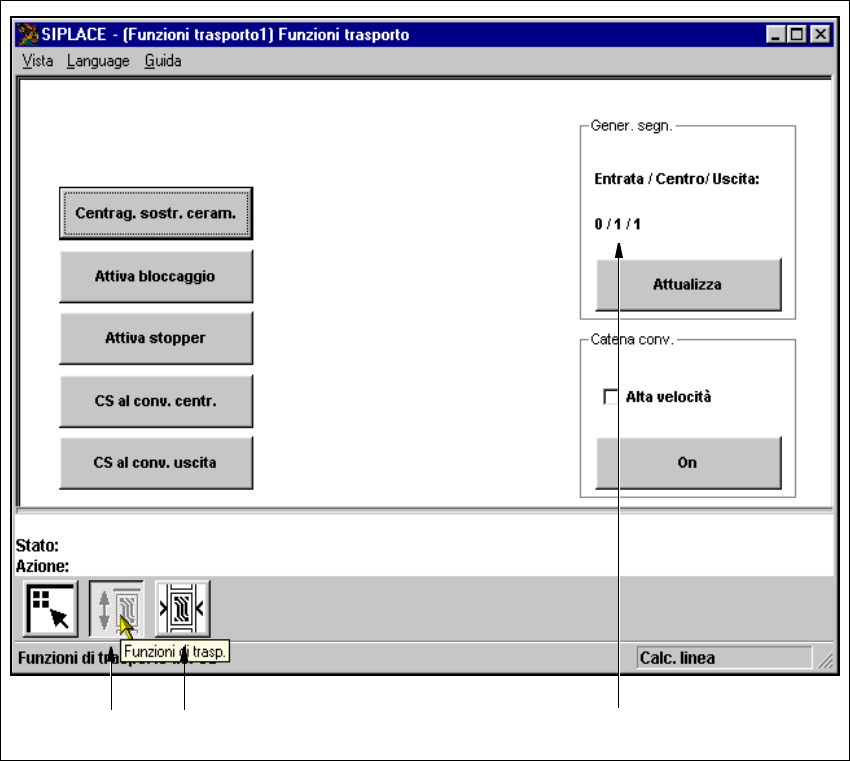 Istruzioni per l’uso SIPLA CE 80S-2 0/F4 5 Funzioni singole Versione software SR.406.xx Edizione 02/2000 IT 5.3 Funzioni singole Trasporto 201 5.3.1 Vi st a "Funzioni trasporto" Le funzioni di trasporto cons en…