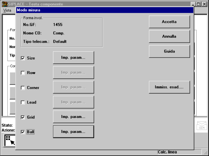 6 Funzioni Vision Istruzioni per l’uso SIPLACE 80S-20/F4 6.6 Testa componente Versione software SR.406.xx Edizione 02 /2000 IT 318 Menu ’Modo misura’ 6 Dopo aver e cliccat o sul ri quadro ’ Modo mis ura’ appare i l menu …