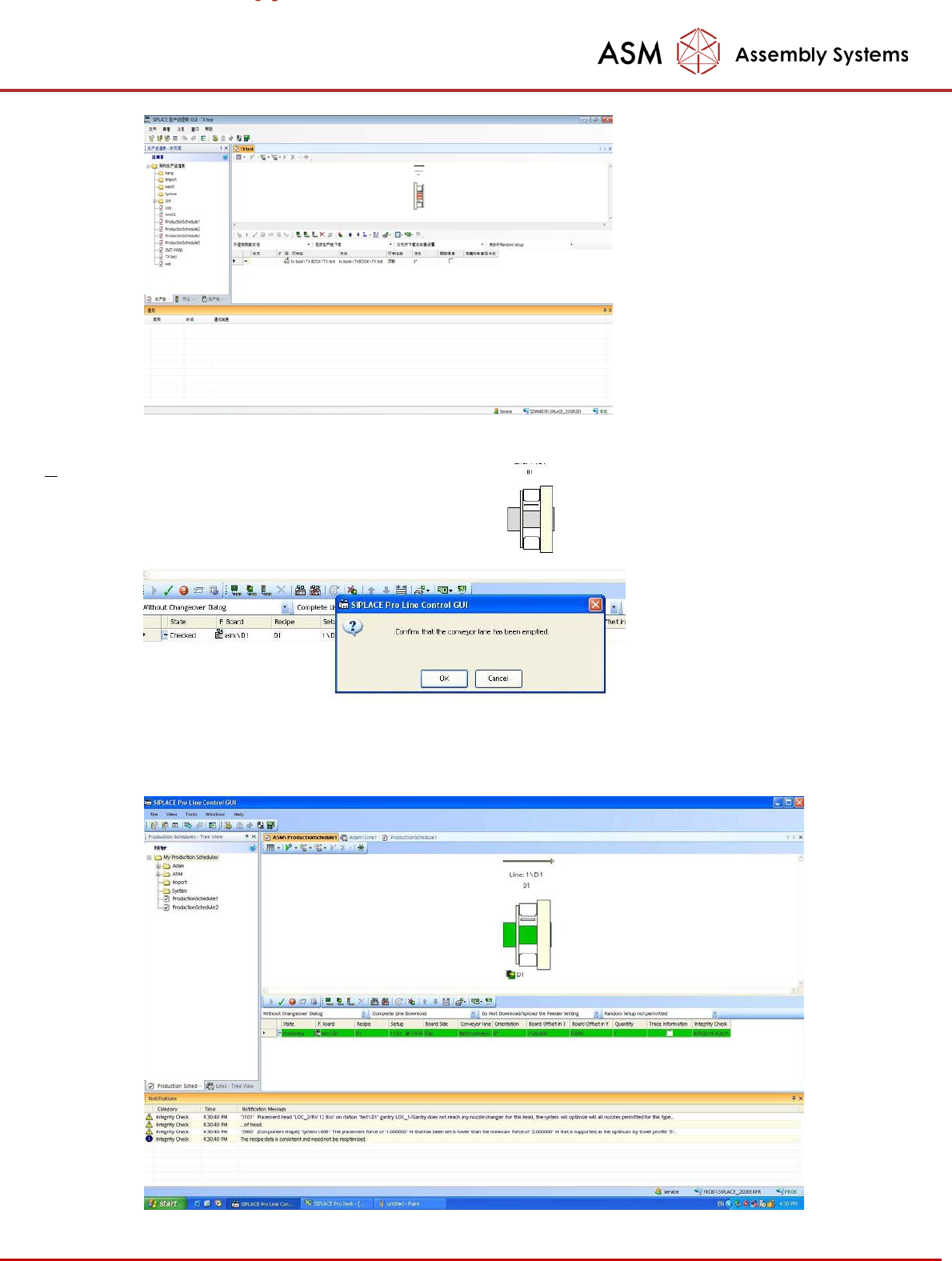 - 27 - 2. 传送程序 从线控计算机上的“ Windows 开始”菜单中,启动 SIPLACE Pro 线控 GUI :开 始 -- > 程序 -- > SIPLACE Pro -- > LCGUI ,或者单击台式机上的 程序图标,软件界面如下: 待软件启动完成后,电脑 会出现如下 GUI 主界面 依照屏幕提示,按下机器的启动 键,机器将执行一个完整的硬件初 始化的过程,该过程正 常完成 后,会有如下信息显示,表…