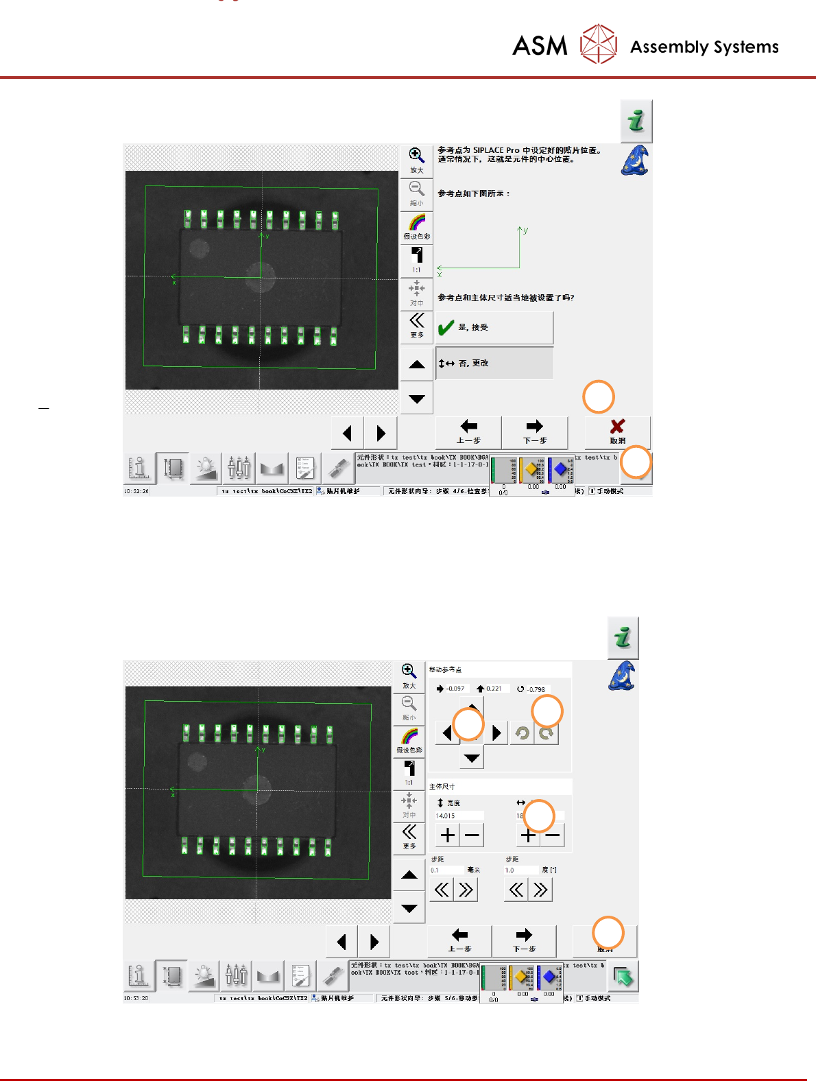 点(确定贴片精确度)是否可以在元件的中心位置精确地识别,如有必要,移动参考点 (2)