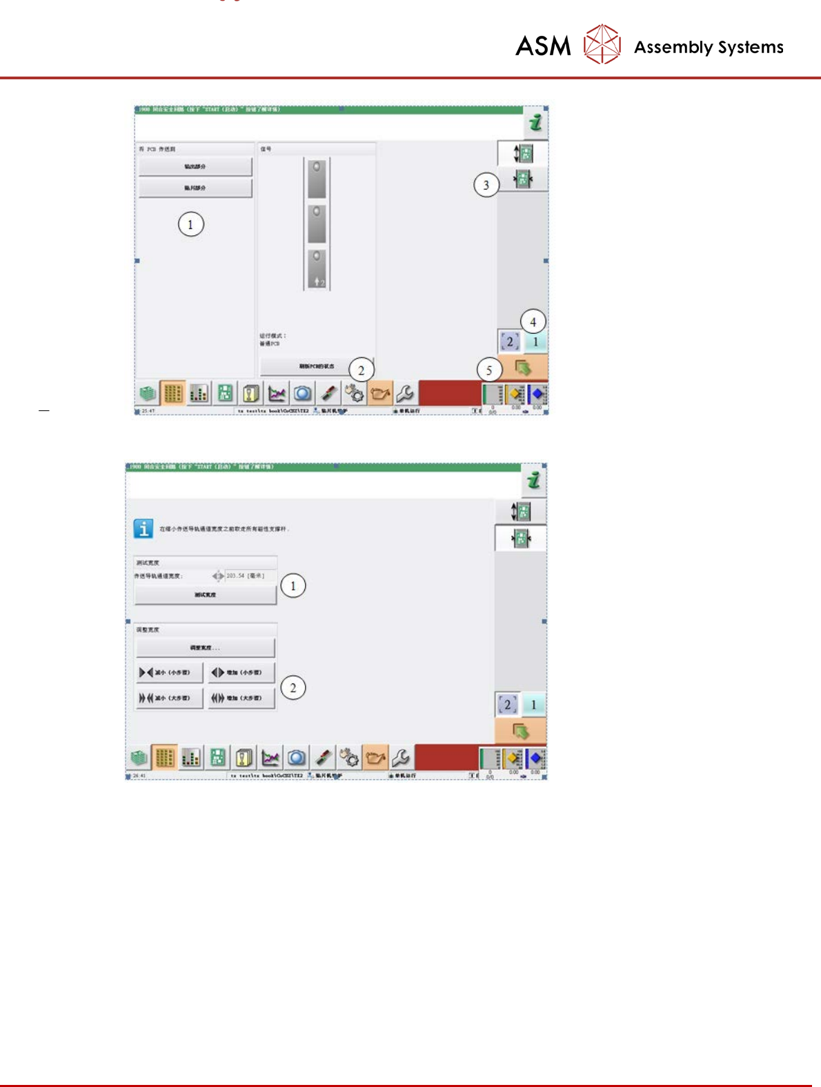 - 73 - ① 检查轨道的传送及 PCB 在 轨道里的传送是否顺畅 ② 刷 新轨道状态,检查轨道 内是否停留 PCB ; ③ 进入下一个子菜单 ④ 用于选择轨道的边(第一 个轨道或第二个轨道) ⑤ 返回上一 层 菜单。 1 )区两个按键,分别用于测 量轨道宽度和根据给定轨道 宽度调节轨道 2 )区的四个按键,其中左边 两个按键用于手动调宽轨道 ,一个小步距,一个大步距 ;右边两个按键用于调窄轨 道, 同样一个小步距一个大 步距
