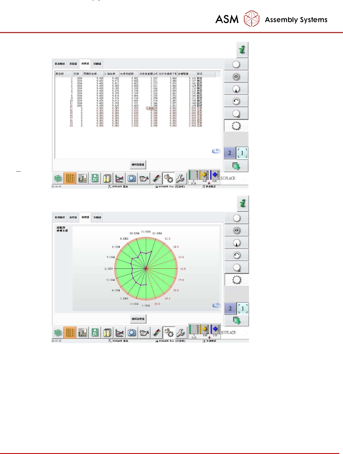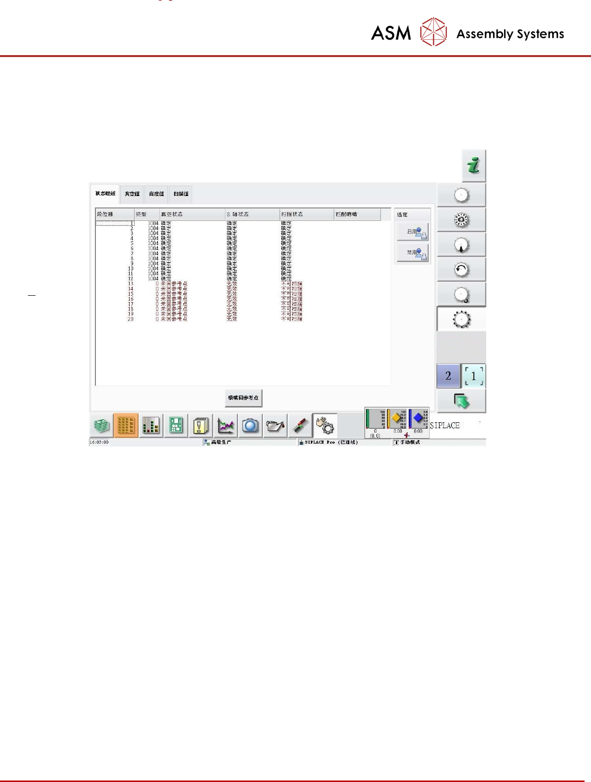“状态 概述”中,执行“吸嘴回参考点”将对吸嘴做一个完整的综合检查,检查结果