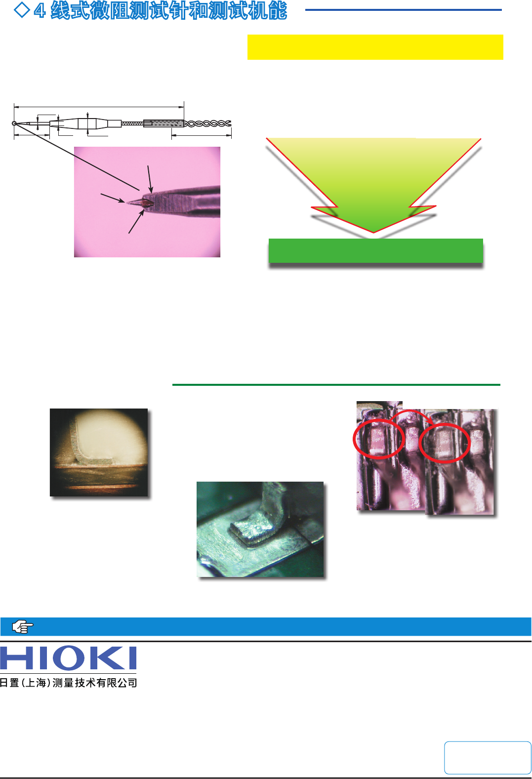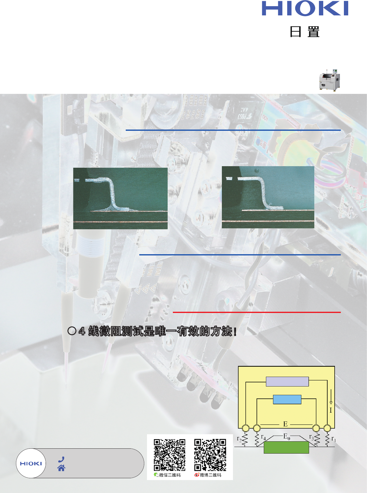 HIOKI 技术指南 ● 何为虚焊? 正常的焊接状态 虚焊状态 ◆ 有无检出方法? 四线微阻测试可以排除机台内阻,接触电阻的影响,从而精确测出 引脚同焊盘间电阻的微小变化。 ※ 如右图所示, 由恒流源加上电流后, 由于电压计的输入阻抗极大, 几乎没有电流流过,故在 r 3 ,r 4 的压降为 0,被测电压 E 和被测物 R0 两端的压降相等,不受 r 1 ~r 4 的影响。 ● 虚焊的影响? ◆ IC引脚的虚焊检出 是指由于表面贴装的 …
