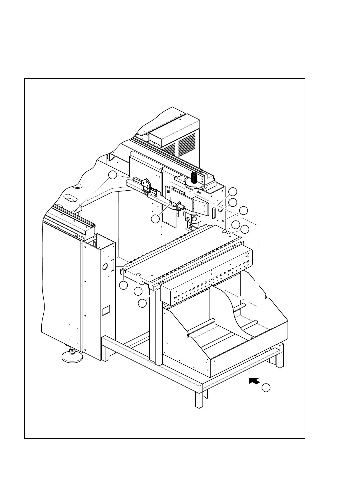 Nosta varovasti komponenttivaihtopöytä nostovaunulla niin ylös, kunnes keskityspultit (8) ovat porausten