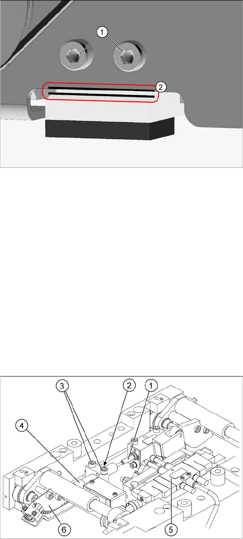► With the aid of a 0.1 mm feeler gauge, check the gap between the conveyor belt and the clamp (see