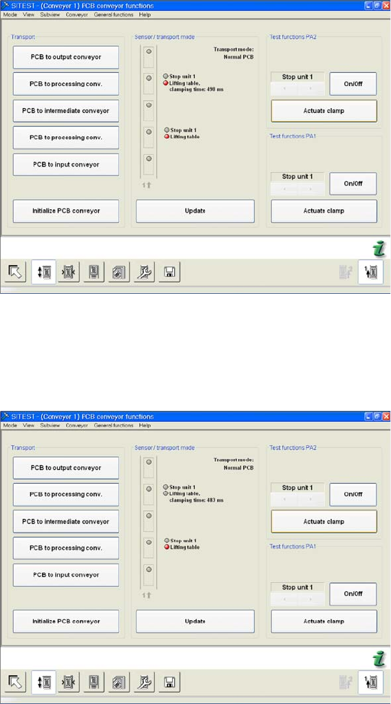 ► In the PCB conveyor functions menu (see adjacent diagram) you can see the travel time for the lifting