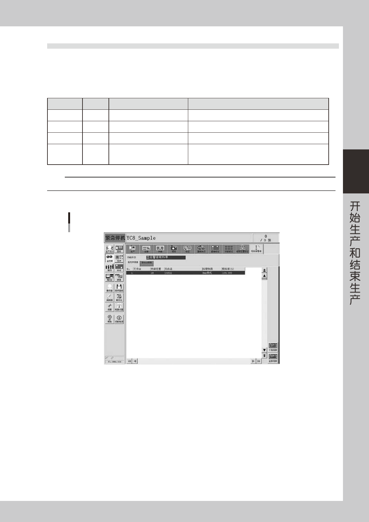 3-20 3 3.9 吸附位置校正 此画面在使用吸附位置校正功能时使用。通过画面可以确认对象元件是如何被校正的。一旦进入 X、Y 方向中任何 一方设置的校正量警告区域或错误区域,监控屏会立即变更显示颜色。监控屏的显示颜色,如下表所示。 ■ 显示颜色表 行的颜色 状态 内容 黄色 警告 已经超出在吸附位置校正规格中设置的各吸嘴数据警告级别值。 红色 错误 已经超出在吸附位置校正规格中设置的各吸嘴数据错误级别值。 n 要点 吸附位置校正规格…