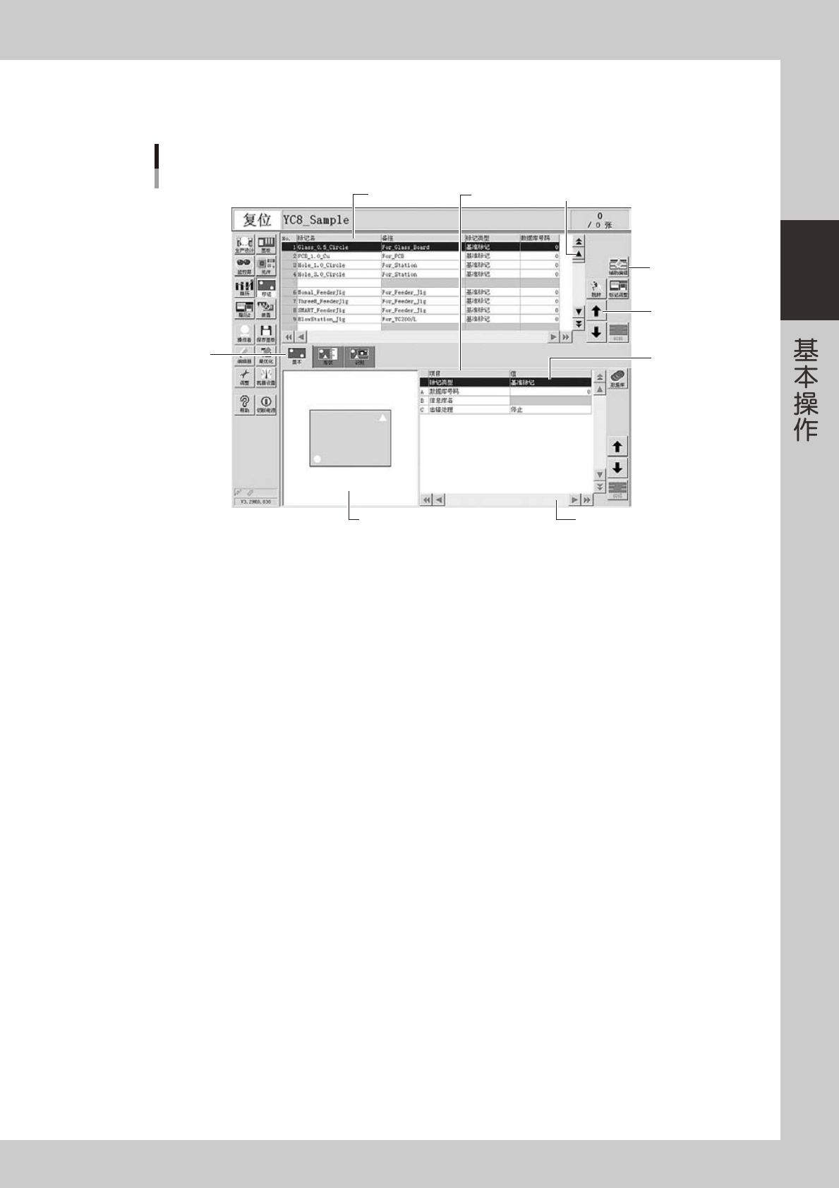2-8 2 2. 操作画面和各种按钮 操作机器之前,必须充分了解软件系统画面的基本构成和操作方法。 2.1 操作画面的基本构成 YC8 贴片机的操作画面由「状态区域」 、 「按钮区域」 、 「自由区域」构成。 按钮区域 1 按钮区域 2 按钮区域 3 状态区域 画面构成示例 生产设计画面 自由区域 26200-N8-00 ■ 画面上的各区域 状态区域 左端显示当前的机器状态 ; 中央显示所选基板的名称 ; 右端显示基板的生产数量。…