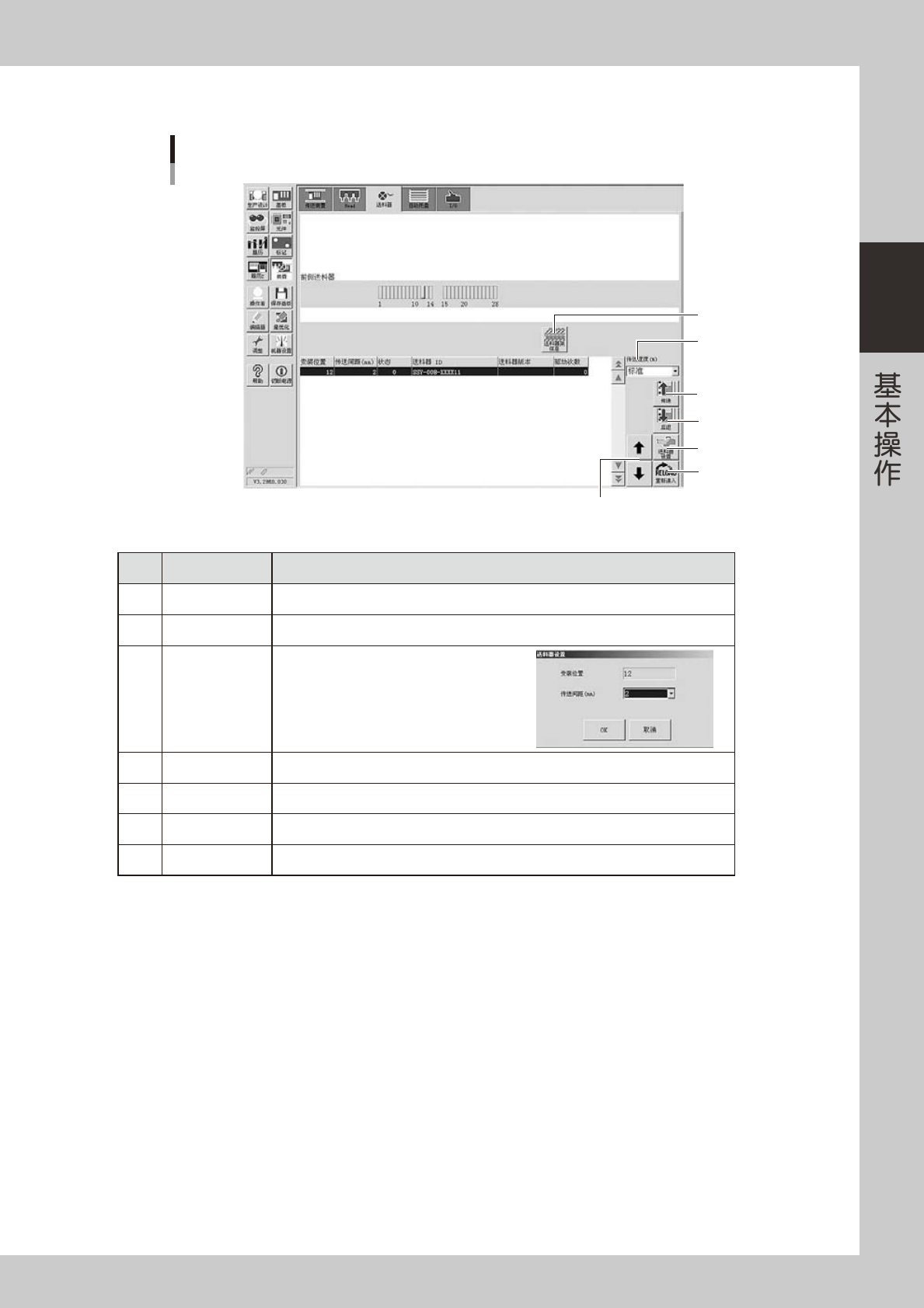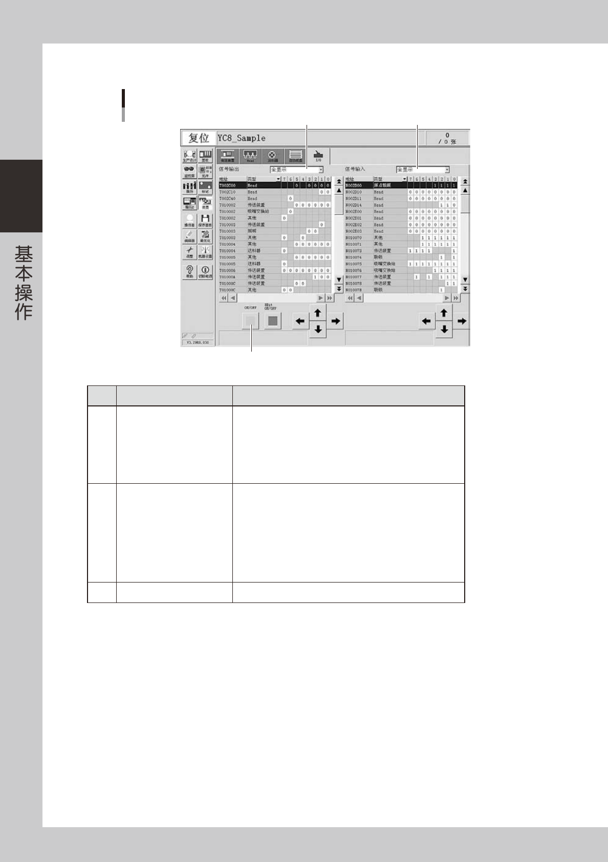 2-16 2 ■ I/O 手动操作 「装置」-「I/O」画面 1 2 3 26209-N8-00 名称 功能 1 「信号输出」下拉框 切换信号输出侧的显示区。 ‧ 送料器 ‧ 吸嘴交换站 ‧ 照明 ‧ 传送装置 ‧ Head ‧ 其他 2 「信号输入」下拉框 切换信号输入侧的显示区。 ‧ 联锁 ‧ 原点极限 ‧ 送料器 ‧ 吸嘴交换站 ‧ 传送装置 ‧ 照明 ‧ Head ‧ 其他 3 [ ON/OFF ] 按钮 使光标选中位置的阀开 …