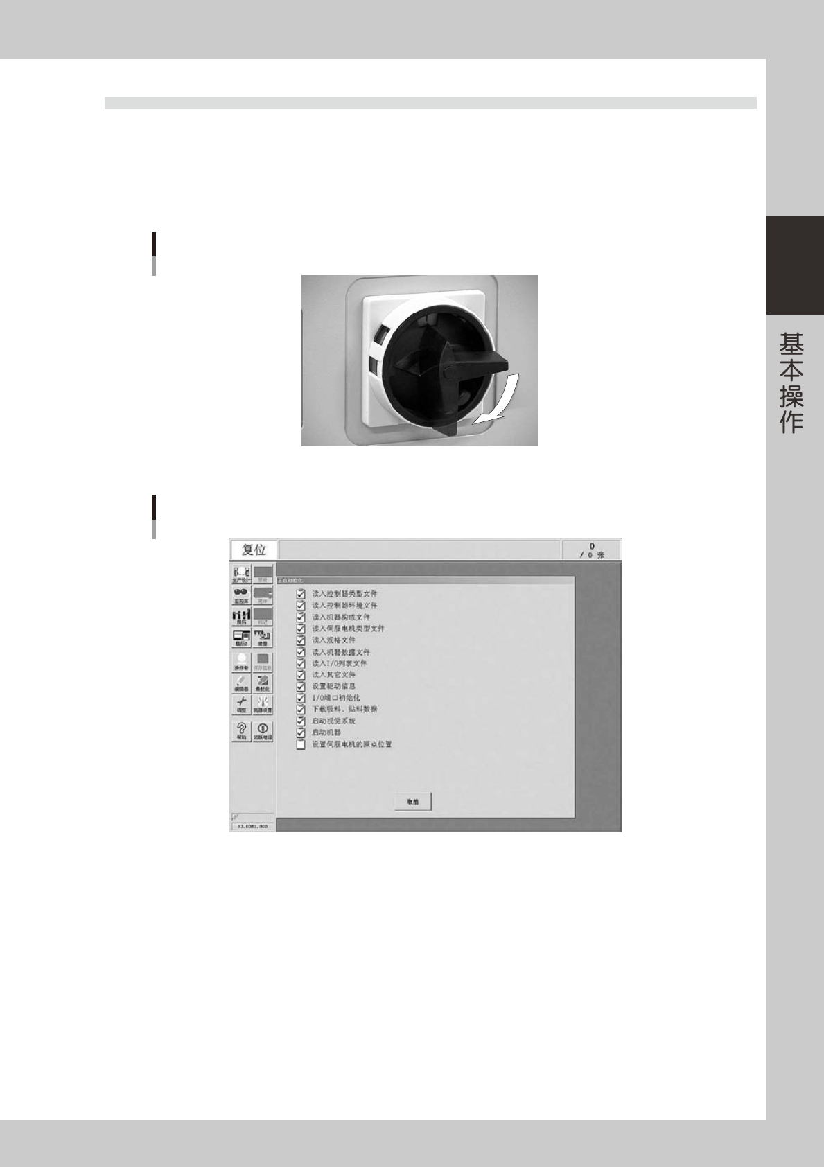 向右转动贴片机正面右下方的电源主控开关至 ON,接通电源。系统启动,载入机器运行所需的程序后,