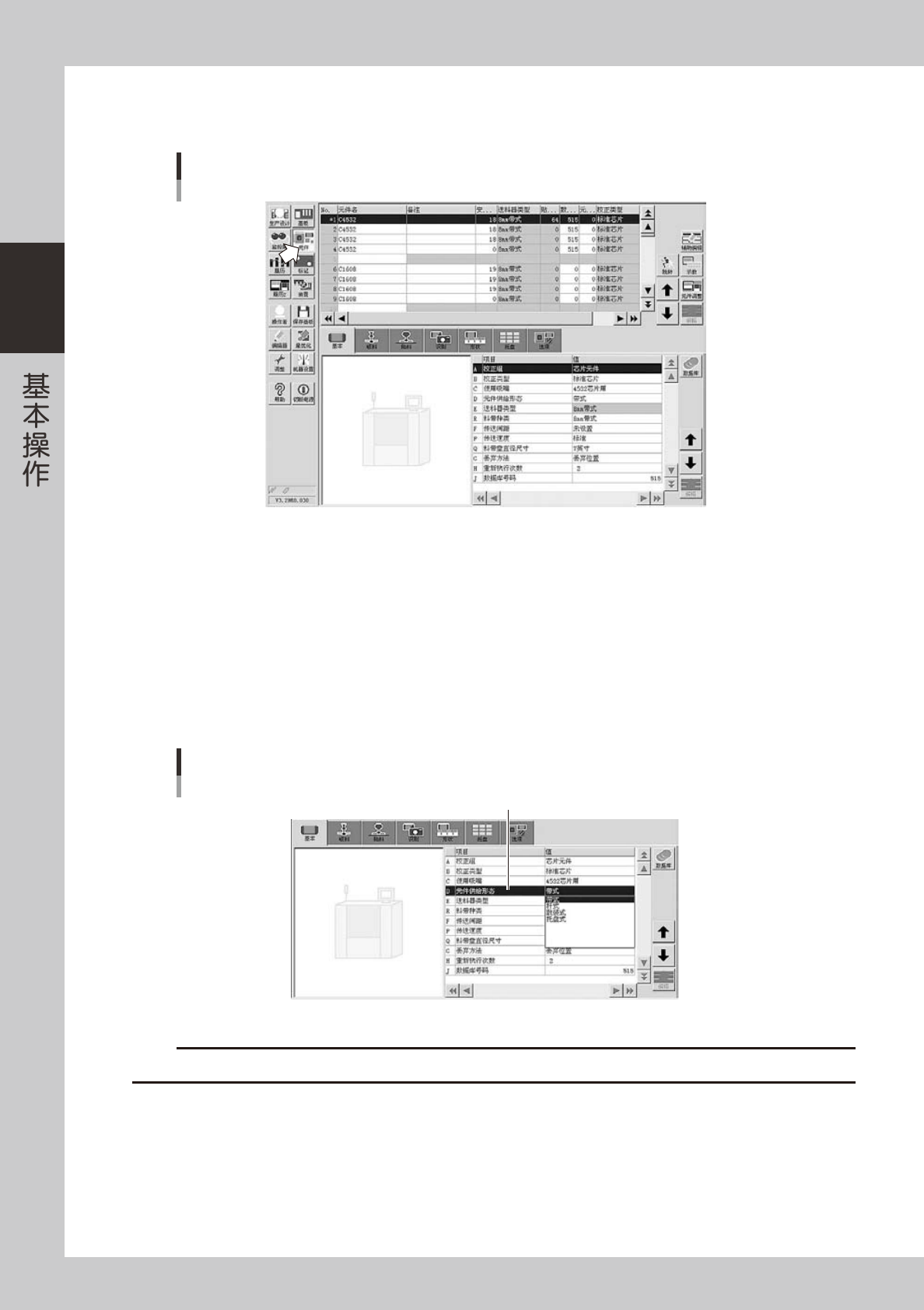 2-38 2 3 打开元件数据画面,选择元件。 按 [ 元件 ] 按钮打开元件数据画面,从画面上方的元件列表中选择相应元件。 元件数据画面 26222-N8-00 4 选择基本参数画面。 选择「基本」选项卡,打开基本参数画面。 5 设置「元件供给形态」 。 选择「D 元件供给形态」后双击输入栏,从下拉框中选择想要使用的元件供给形态。 ‧ 带式元件 : 带式 ‧ 杆装元件 : 杆式 ‧ 盘装元件 : 托盘式 元件数据画面 元件供给形态 「…