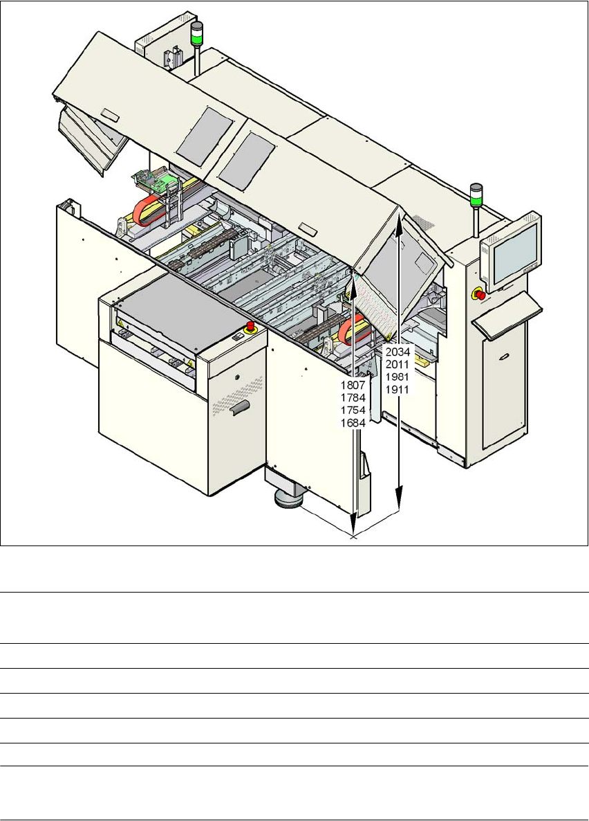 3 贴片机的技术数据 用户手册 SIPLACE D1i/D2i 3.4 尺寸和重量 源自软件版本 SR.605.03 SP2 2012 年 10 月 中文版 106 3.4.3 保护罩向上折起高度 3 图 3.4 - 2 保护罩向上折起高度 - 尺寸以毫米为单位 请注意 3 也可使用气动弹簧增加保护罩的打 开角度。 PCB 传送导轨高度 升起保护罩底部边缘位置的 高度 升起保护罩顶部边缘位置的 高度 950 mm 1807 2034 9…