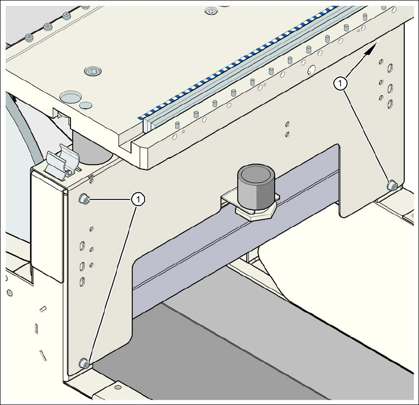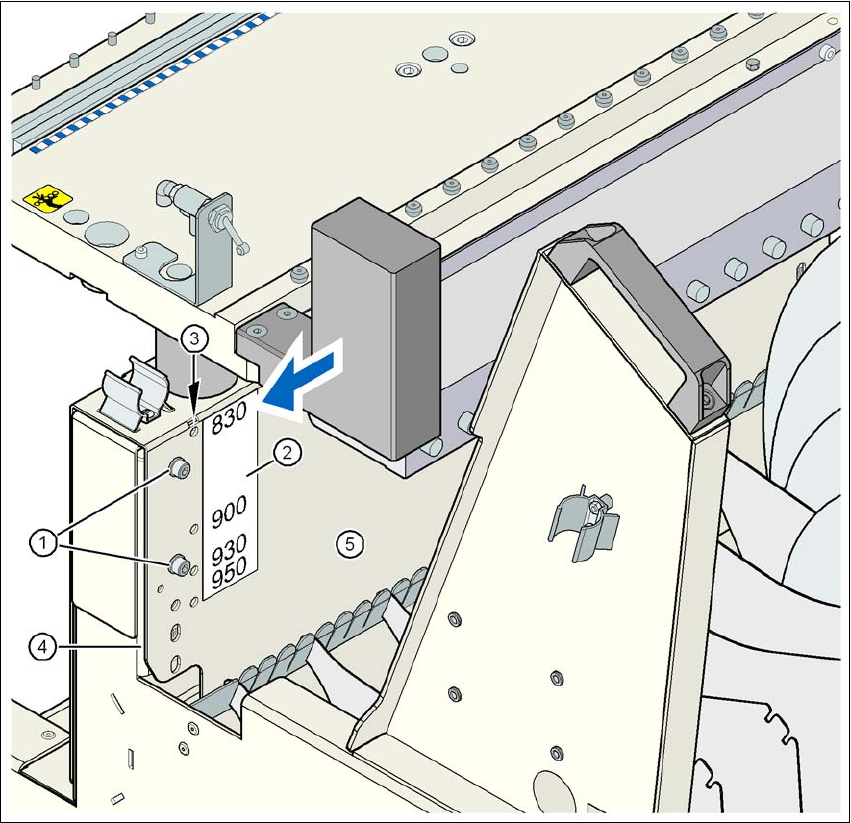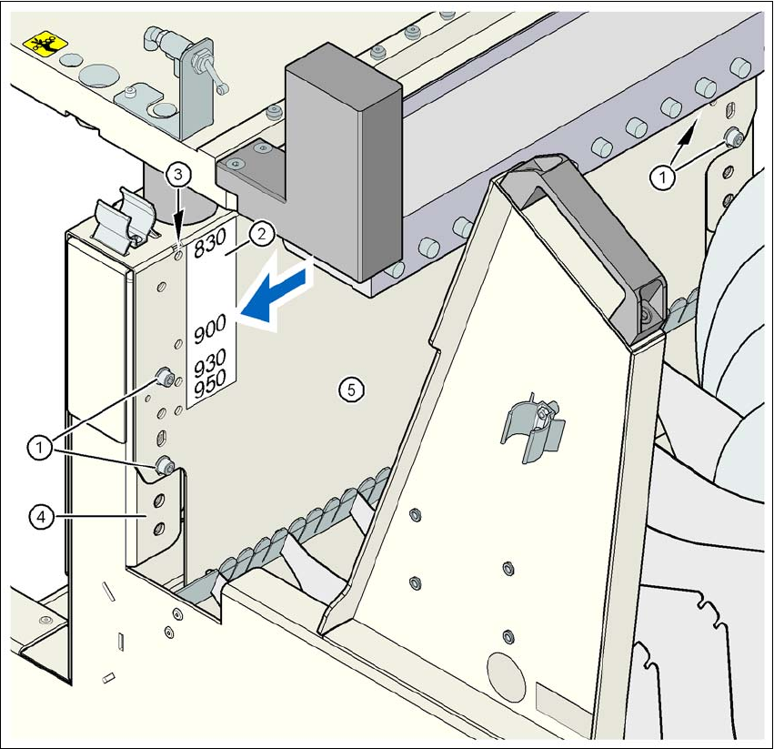 4 安装和试运行 用户手册 SIPLACE D1i/D2i 4.4 根据 PCB 传送导轨高度调整料车 源自软件版本 SR.605.03 SP2 2012 年 10 月 中文版 218 4 图 4.4 - 3 料车: PCB 传送导轨高度 830 mm - 前视图,六角套筒螺钉 的位置 (1) 六角套筒螺 钉 M6x12 和垫圈 ( 4x 在前面板上)