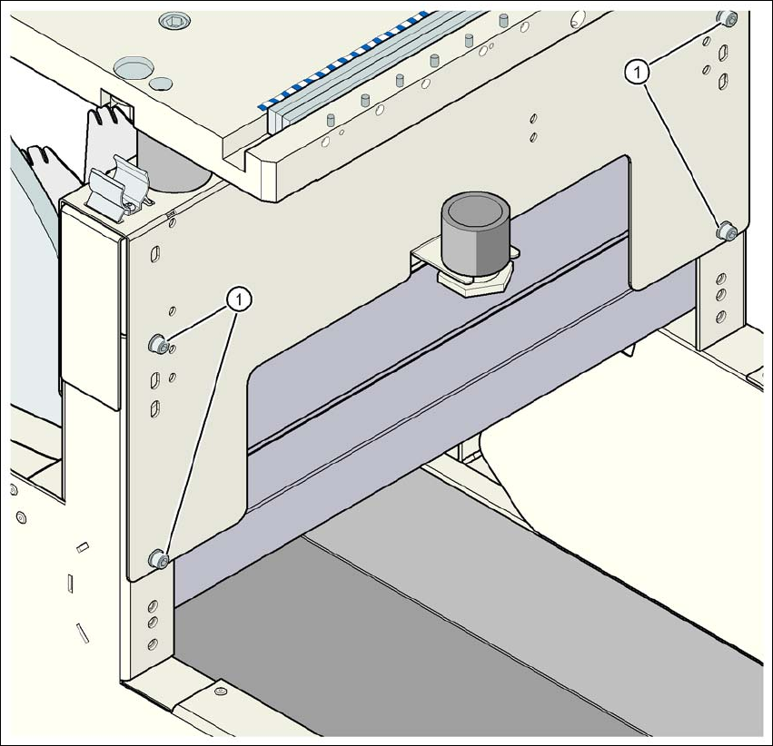 4 安装和试运行 用户手册 SIPLACE D1i/D2i 4.4 根据 PCB 传送导轨高度调整料车 源自软件版本 SR.605.03 SP2 2012 年 10 月 中文版 220 4 图 4.4 - 5 料车: PCB 传送导轨高度 900 mm - 前视图,六角套筒螺钉 的位置 (1) 六角套筒螺 钉 M6x12 和垫圈 ( 4x 在后面板上)