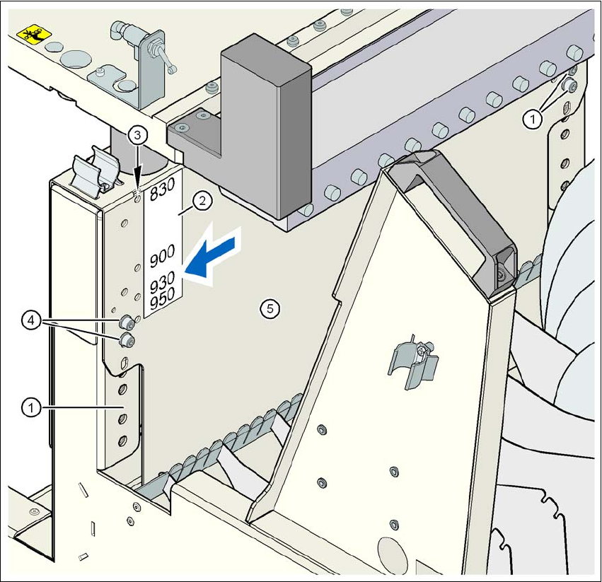 (3) 4 个检验孔用于检查预设的高度。如果检验孔未被垂直侧梁 (4) 盖住,则选中的高度预设正确