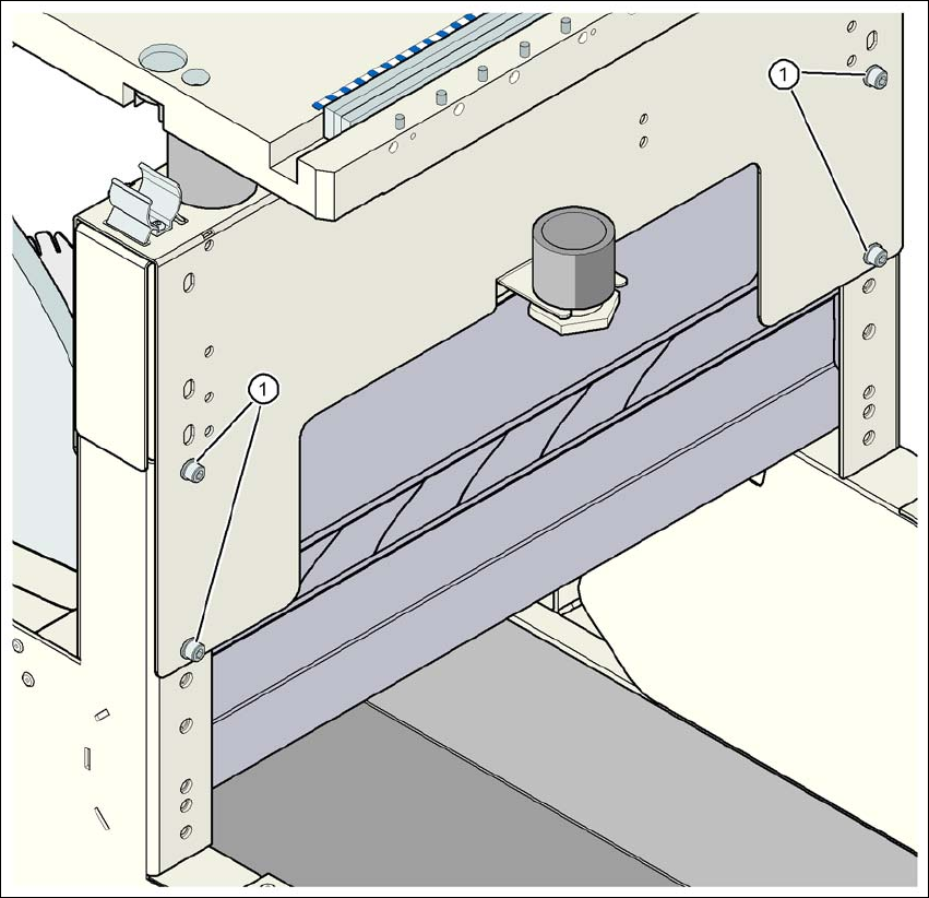 4 安装和试运行 用户手册 SIPLACE D1i/D2i 4.4 根据 PCB 传送导轨高度调整料车 源自软件版本 SR.605.03 SP2 2012 年 10 月 中文版 224 4 图 4.4 - 9 料车: PCB 传送导轨高度 950 mm - 前视图,六角套筒螺钉 的位置 (1) 六角套筒螺 钉 M6x12 和垫圈 ( 4x 在后面板上)