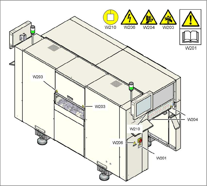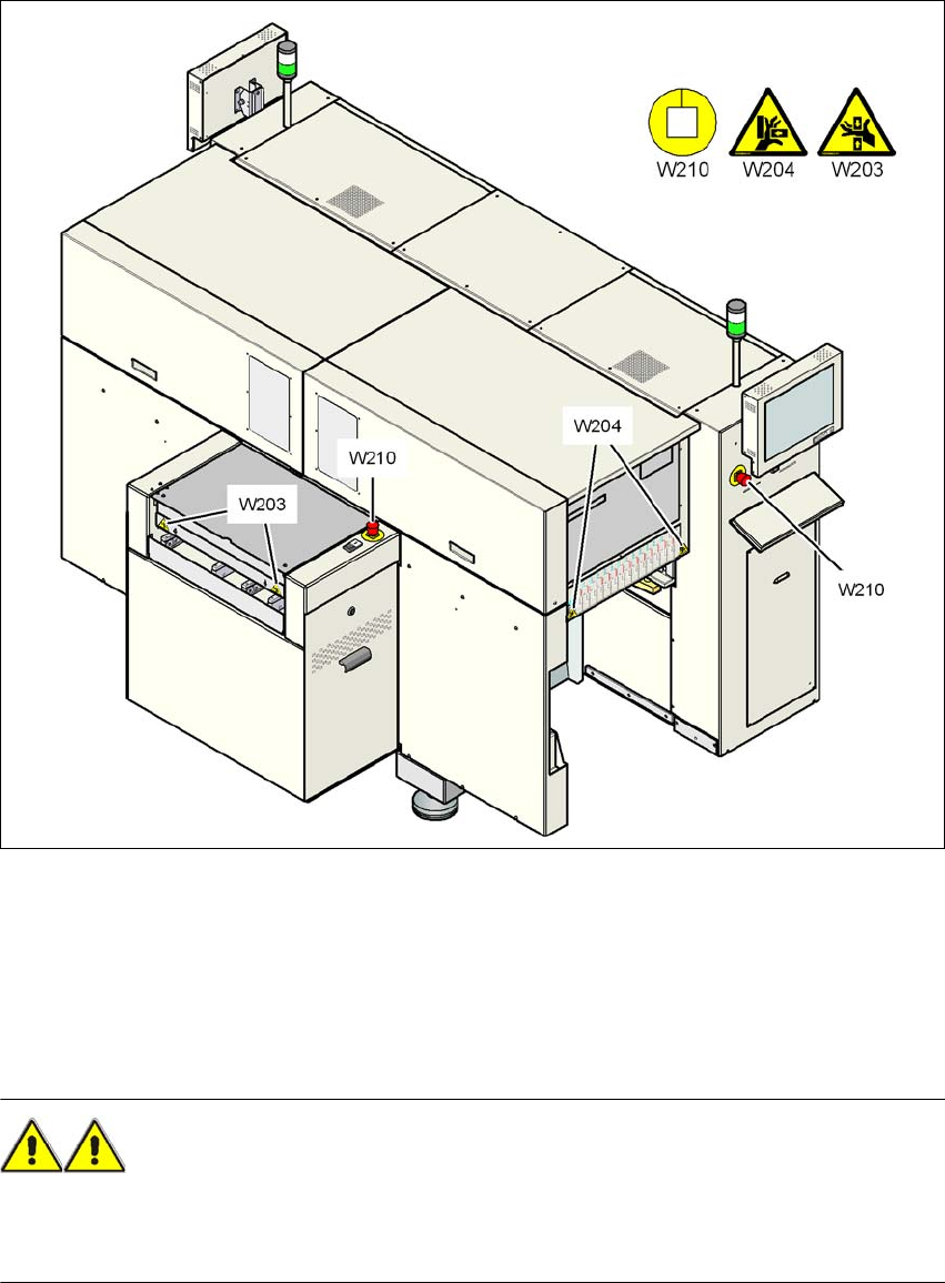 用户手册 SIPLACE D1i/D2i 2 安全操作 源自软件版本 SR.605.03 SP2 2012 年 10 月 中文版 2.2 警告标签 41 2.2 警告标签 2.2.1 贴片机上的警告标签 警告标签由软质 PVC 薄膜制造而成, 该薄膜耐磨损、 耐晒、 且能抗水浸和风化。 其设计符 合 ISO 3864-2 和 ANSI Z535.4 的 要求。 2 图 2.2 - 1 D1i/D2i 贴片机上的警告标签 W201 、 W…