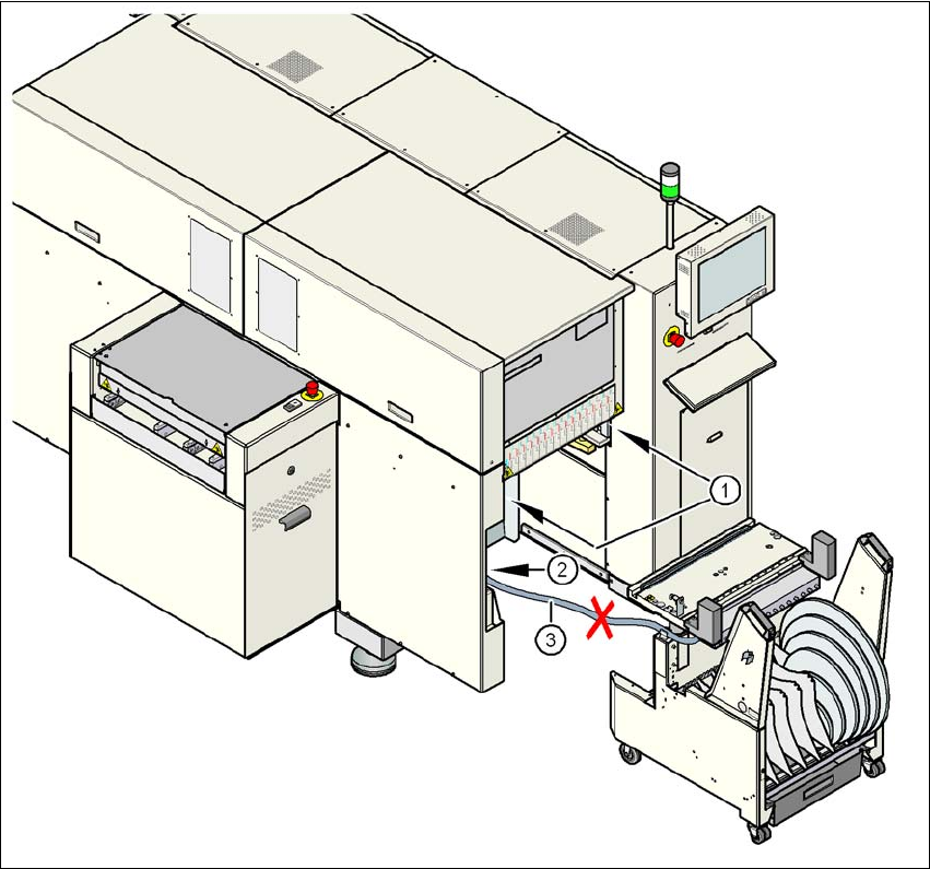 → 降低元件料台底座之前,始终将料车的电源电缆 (图 2.5 - 3