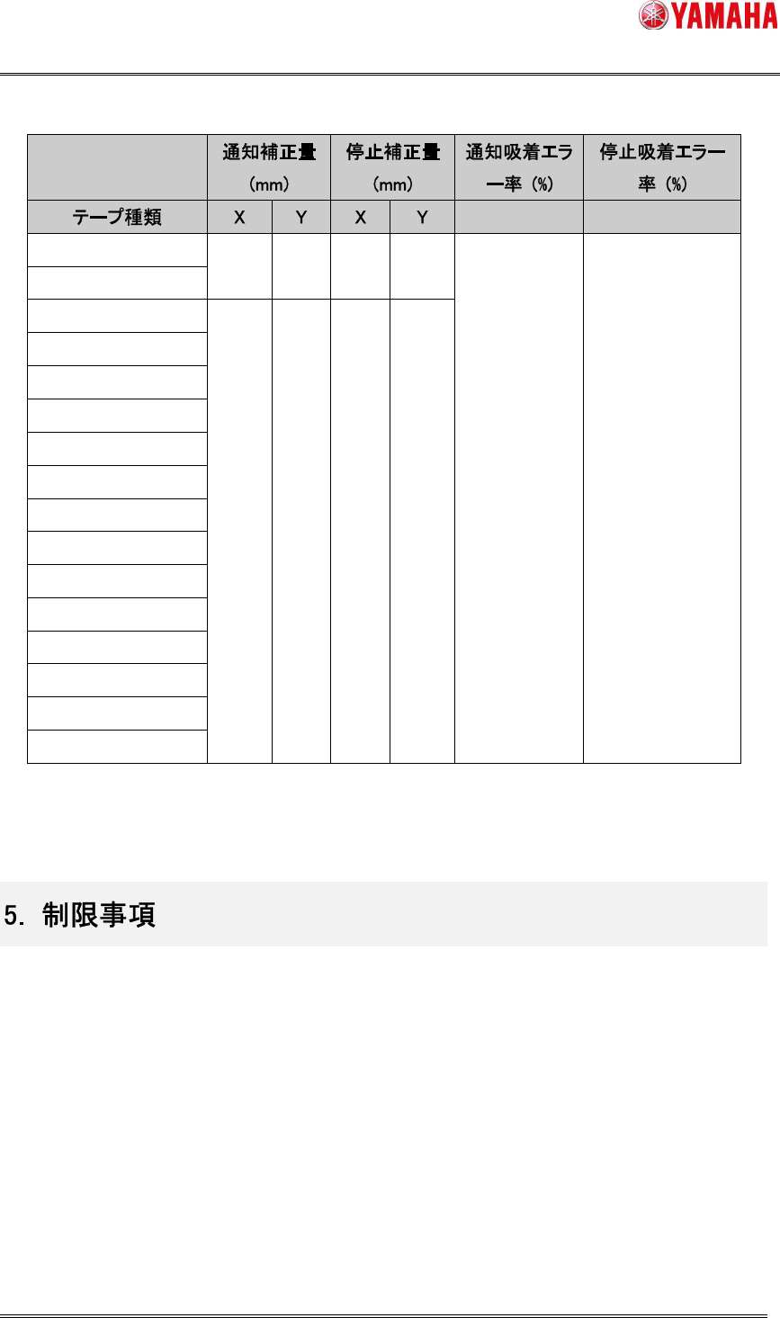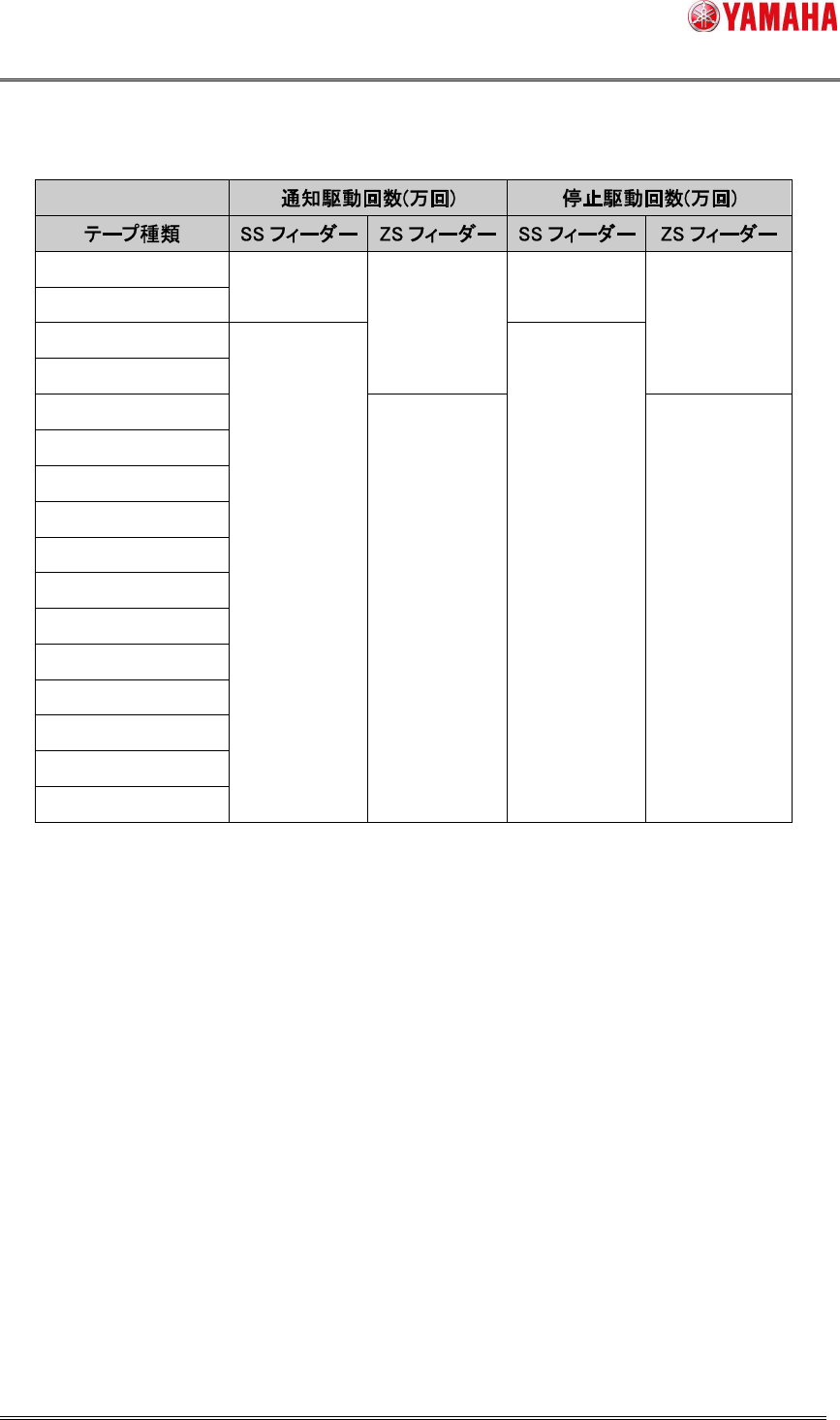 ヤマハ発動機株式会社 IM 事業部 マウンター技術部 ソフト開発グループ MDOC-SOFT50282 19/19 表 4.4 フィーダー マックス補正量/吸着エラー率 推奨値(フィーダーメンテナンス推奨周期) 4mm テープ 0.200 mm 0.200 mm 0.000 mm 0.000 mm 1.00% 0.00% 8mm テープ 12mm/16mm テープ 対 象 …