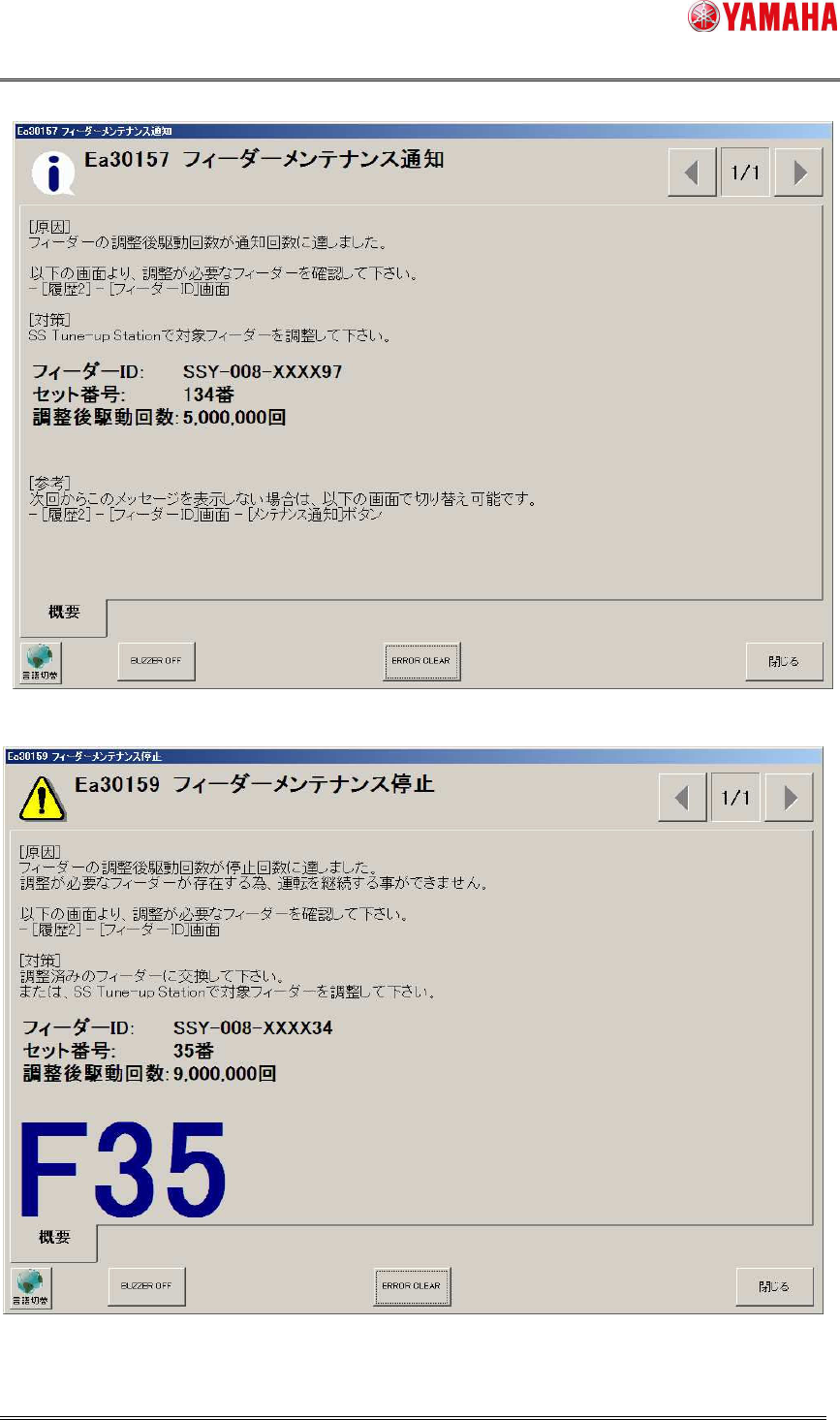 ヤマハ発動機株式会社 IM 事業部 マウンター技術部 ソフト開発グループ MDOC-SOFT50282 8/19 図 3.3 「 フィーダーメンテナンス通知」(補正量)メッセージ 図 3.4 「フィーダー メンテナンス停止」(補正量)エラー
