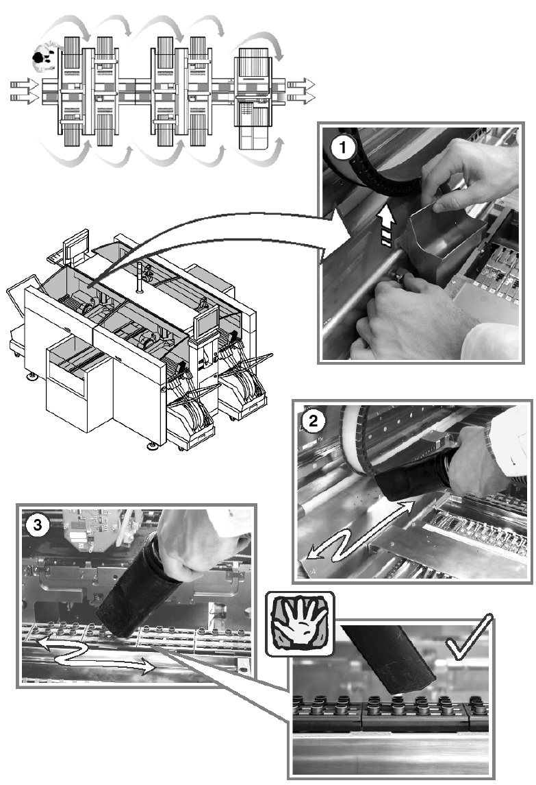 預防保養手冊 HS 保養手冊 03/2003 版 5 每日保養工作 19 5 在執行每日的清潔工作時,您需 要用到垃圾桶及真空吸塵器 。 5 5 為減少停機時間,請依照圖中所 示的順序進行清潔工作。 5 5 ○ 當懸臂來到取置位置上方時,按 下第一個工作站的停止鈕。 如此可讓您的工作區保持淨空。 5 ○ 打開保護蓋。 5 清空拋料容器 5 取出拋料容器,並將它的內容物 清空到收集容器中。 5 建議您每日清空拋料容器。這樣 ,您將可以…