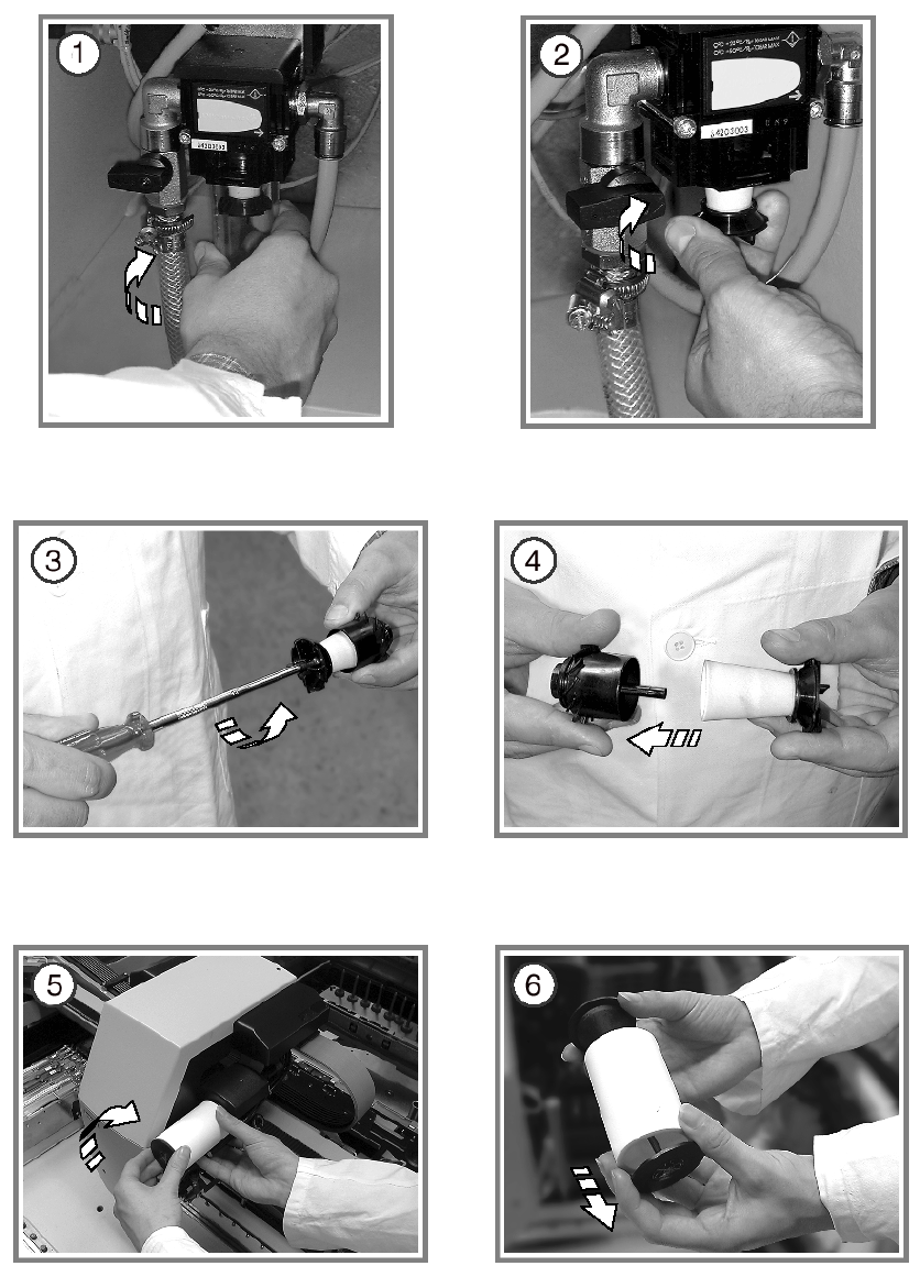 依前述的相反順序來更換骯髒的過濾器,並裝上新的過濾器 ( 參閱 HS-50 的照片 )。