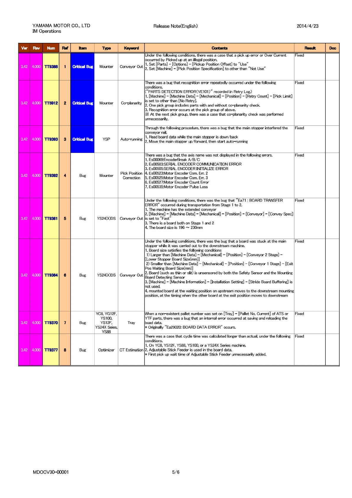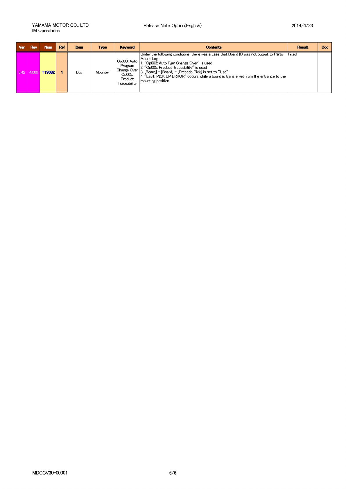 YAMAMA MOTOR CO., LTD IM Operations Release Note Option(English) 2014/4/23 Ver Rev Num Ref Item Type Keyword Contents Result Doc 3.42 4.000 TT9382 1 Bug Mounter Op003: Auto Program Change Over Op005: Product Traceability…