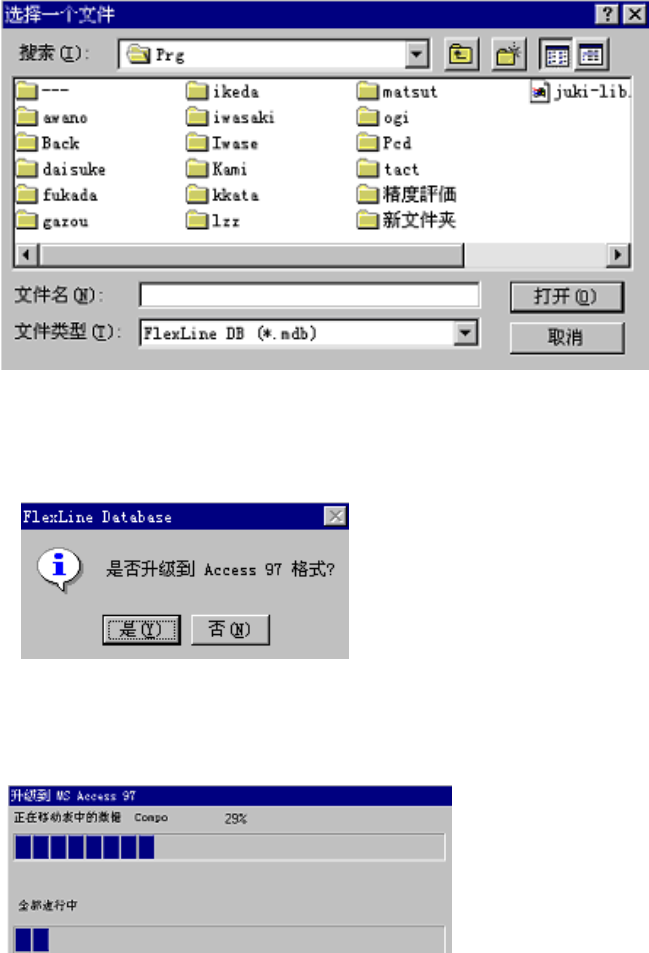 第 5 章 其它功能 Rev03 4) 数据库文件转换为 Access97 形式 把数据库文件转换为 Microsoft 公司的“Access97”形式后,可以用 Access97 进行操 作。但是,转换为 Access97 形式的数据,无法还原成转换前的数据库形式。 < 步骤 > ① 在菜单栏中,单击「工具」/「数据库工具」/「升级到 Access97 格式」。 ② 显示“选择一个文件” 画面。选择文件后,单击「打开」。 图 5-1-…