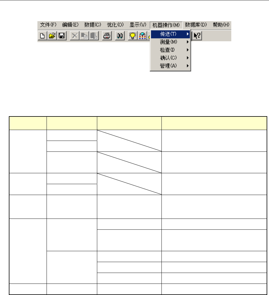 第 4 章 生产程序编辑 Rev03 4-5-4 机器操作 在主机上实际执行各种操作时,选择[机器操作],再从下拉菜单上选择所需的对应项目。 图 4.5. 4.1 机器操作选择 画面 各菜单项目及其子菜单、功能概述如下: 菜单项目 子菜单1 子菜单2 概要 基板送入 基板送出 基板的传入或传出。 传送 自动调整基板宽 度 调整基板宽度。(选项) 单独 测量 连续 测量元件数据的各项具体值。 检查 速度确认 进行模拟生产, 确认运行中的 …