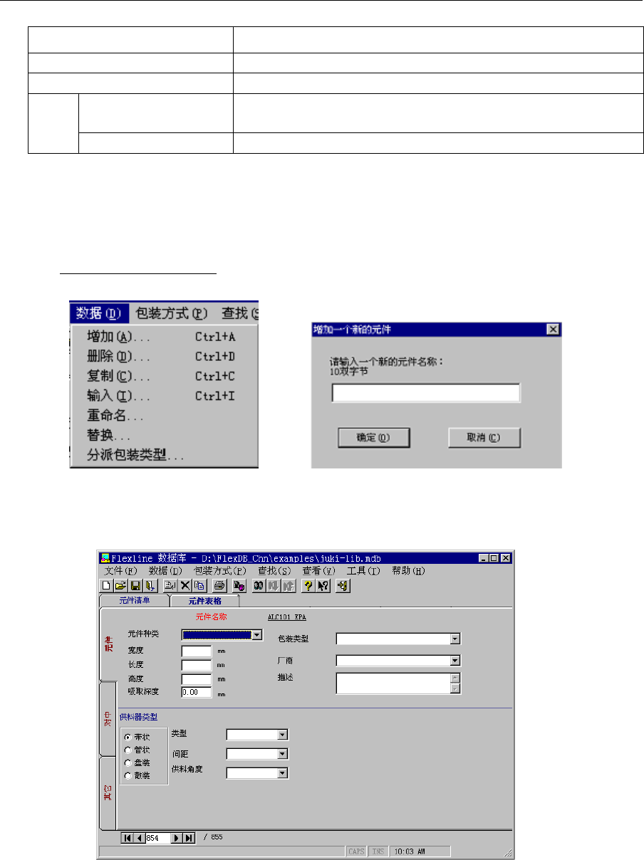 第 5 章 其它功能 Rev03 5-1-3 制作、编辑元件数据 元件数据的新建、编辑步骤如下。 设定项目 内 容 增加 输入新建元件名,制作元件数据。 复制 不修改已生成的元件数据内容,只复制其内容后改名。 注册到数据库 将生 产 程序 文 件或 其 他的 数 据库 里 注册 的 元件 数 据一 次 性 全 部地注册到数据库里。 注册 在编辑程序时注册 将生产程序文件里的元件数据逐个注册到数据库。 5-1-3-1 增加 新建元件数据。…