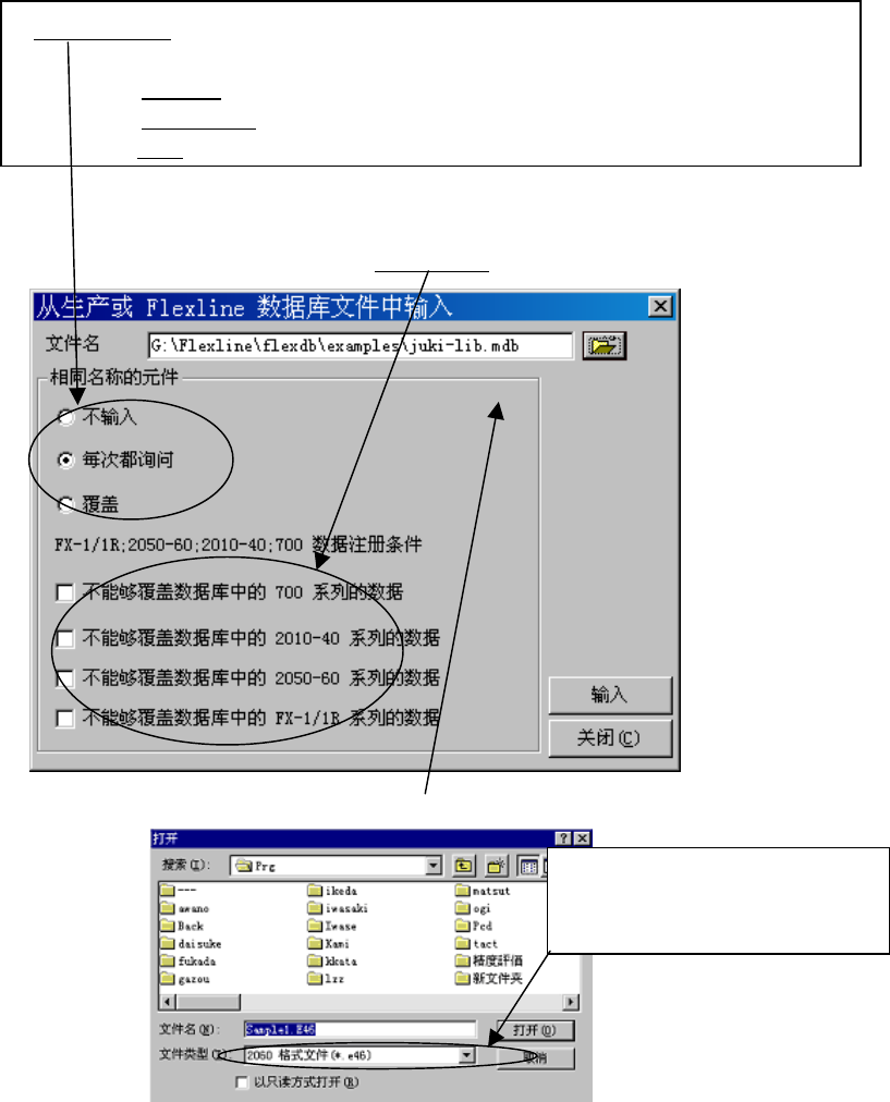 第 5 章 其它功能 Rev03 5-1-3-3 注册(在数据库上注册) 把生产程序,或在其他数据库注册过的全部元件数据,统一注册到编辑程序里。 < 步骤 > 1) 在菜单栏上单击「数据」/「输入」。 2) 出现如下画面后,请选定文件名和注册时的条件。 ①指定输入条件。 ※ 输入条件 : 统 一 注册时要指定: 如数据库有同名元件时, 是选择覆盖注册、 或不注册。 ● 不输入:不覆盖同名元件。 ● 每次都询问:要求提示,是否要覆盖同…